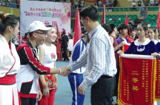 表演結(jié)束,裁判宣布結(jié)果:我院啦啦操隊(duì)勇奪規(guī)定組二等獎(jiǎng)和自由組三等獎(jiǎng)。羅廷榮副校長給隊(duì)員們頒發(fā)錦旗,雙豐院長與啦啦操隊(duì)員親切合影。