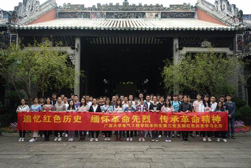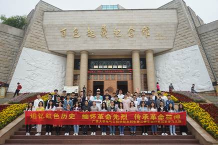2018年10月14日,廣西大學電氣工程學院本科生第三黨支部一行49人(含積極分子)赴紅色根據地百色開展主題黨日活動,接受老一輩革命先烈事跡的再教育。期間,先后參觀了鄧小平手跡碑林、百色起義紀念館、紅軍橋、右江民族博物館、粵東會館。