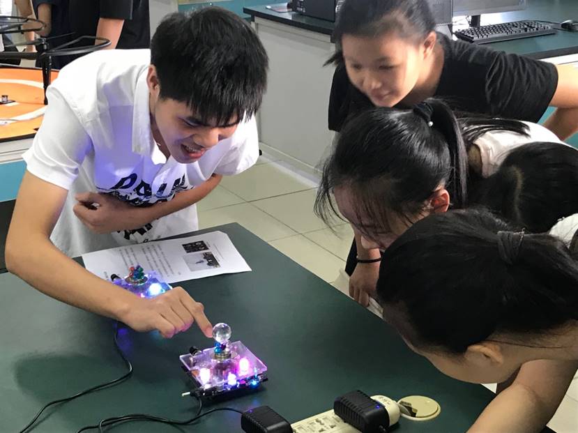 接著,同學(xué)們參觀了電氣工程學(xué)院本科生的優(yōu)秀科研作品展,電氣工程學(xué)院大二、大三、大四的同學(xué)為他們講解了仿真機(jī)器人、磁懸浮、航拍機(jī)等作品的功能和原理,這一環(huán)節(jié)大大激發(fā)了同學(xué)們對(duì)科技創(chuàng)新的興趣與熱情。