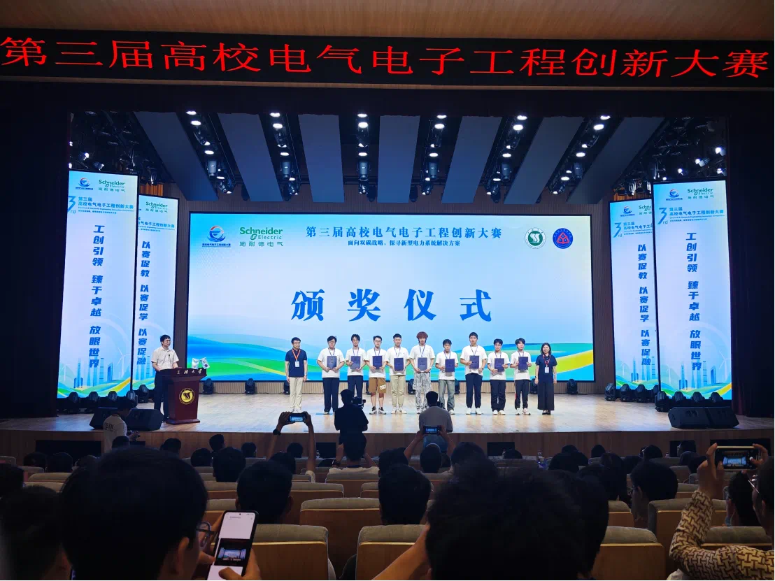 獲獎(jiǎng)名單 據(jù)了解,高校電氣電子工程創(chuàng)新大賽是中國(guó)電工技術(shù)學(xué)會(huì)主辦的公益性競(jìng)賽活動(dòng),本屆大賽共有來自全國(guó)34個(gè)省、直轄市、自治區(qū)的375所高校3075個(gè)團(tuán)隊(duì)報(bào)名,經(jīng)過初賽、復(fù)賽,最終有78所高校的152個(gè)參賽團(tuán)隊(duì)進(jìn)入全國(guó)總決賽。在總決賽中,評(píng)選出全國(guó)特等獎(jiǎng)23項(xiàng)、一等獎(jiǎng)54項(xiàng)、二等獎(jiǎng)63項(xiàng)。 我院參賽團(tuán)隊(duì)經(jīng)過長(zhǎng)期的深入研究和實(shí)驗(yàn)驗(yàn)證,開發(fā)了一種基于絕緣油中多元化學(xué)標(biāo)志物實(shí)時(shí)預(yù)測(cè)變壓器絕緣剩余服役壽命的軟件系統(tǒng),能夠通過5G通信技術(shù)將變壓器傳感器檢測(cè)的化學(xué)標(biāo)志物數(shù)據(jù)傳輸至系統(tǒng),實(shí)現(xiàn)變壓器絕緣剩余服役壽命在線預(yù)測(cè)和絕緣狀態(tài)智能診斷,為變壓器運(yùn)維人員提供一種無損檢測(cè)和智能診斷的方案,該系統(tǒng)已在部分變電站中應(yīng)用。未來,該團(tuán)隊(duì)將圍繞大型油浸式電力變壓器壽命預(yù)測(cè)與故障診斷開展進(jìn)一步研究,旨在為解決該領(lǐng)域的“卡脖子”難題貢獻(xiàn)智慧。 頒獎(jiǎng)儀式 近年來,我院高度重視學(xué)生的創(chuàng)新能力和實(shí)踐能力的培養(yǎng),學(xué)生們積極參與各類學(xué)術(shù)競(jìng)賽,取得了豐碩的成果。此次大賽成績(jī)的取得,是我院持續(xù)深化教育教學(xué)改革、提高人才培養(yǎng)質(zhì)量的生動(dòng)體現(xiàn)。我院將繼續(xù)鼓勵(lì)和支持學(xué)生參與各類學(xué)術(shù)競(jìng)賽,培養(yǎng)更多具有創(chuàng)新精神和實(shí)踐能力的高素質(zhì)人才。