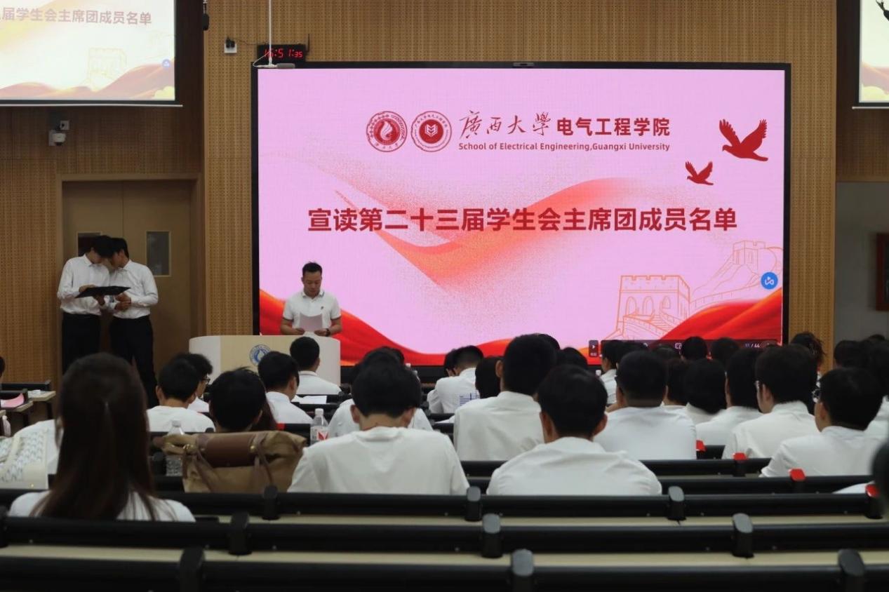 主持人劉家成同學(xué)宣讀第二十三次學(xué)生代表大會常任代表當選名單,同時宣讀學(xué)院第五屆眾創(chuàng)空間、第四屆學(xué)生新媒體中心、第一屆黨建工作中心及廣西大學(xué)就業(yè)與職業(yè)發(fā)展協(xié)會電氣分會第十八屆干部名單。