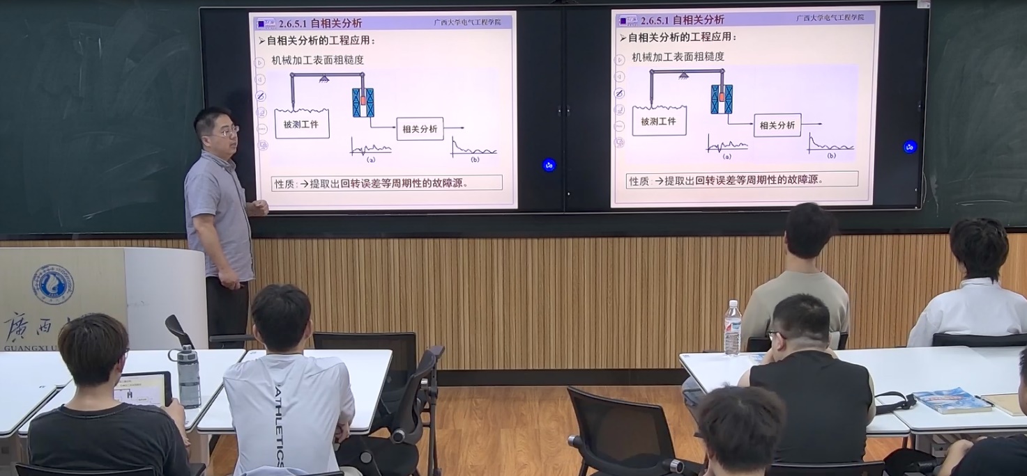 觀看視頻后,韋老師首先肯定視頻中的加工精度滿足了要求,同時引出“要檢測視頻中的核容器加工表面是否存在周期性誤差,應(yīng)該怎么做”的問題,根據(jù)此問題引出自相關(guān)分析算法的數(shù)學原理,著重強調(diào)了“噪音信號的自相關(guān)函數(shù)隨時移迅速衰減,而周期信號的自相關(guān)函數(shù)仍然是同頻率的周期信號”的重要性質(zhì),引導同學們思考解決問題的思路。最后,組織同學們探討了“應(yīng)用自相關(guān)分析法檢測淹沒在噪音信號中的周期信號,以發(fā)現(xiàn)核容器加工表面是否存在回轉(zhuǎn)機構(gòu)偏心引起的周期性誤差”的原理和實現(xiàn)技術(shù)。