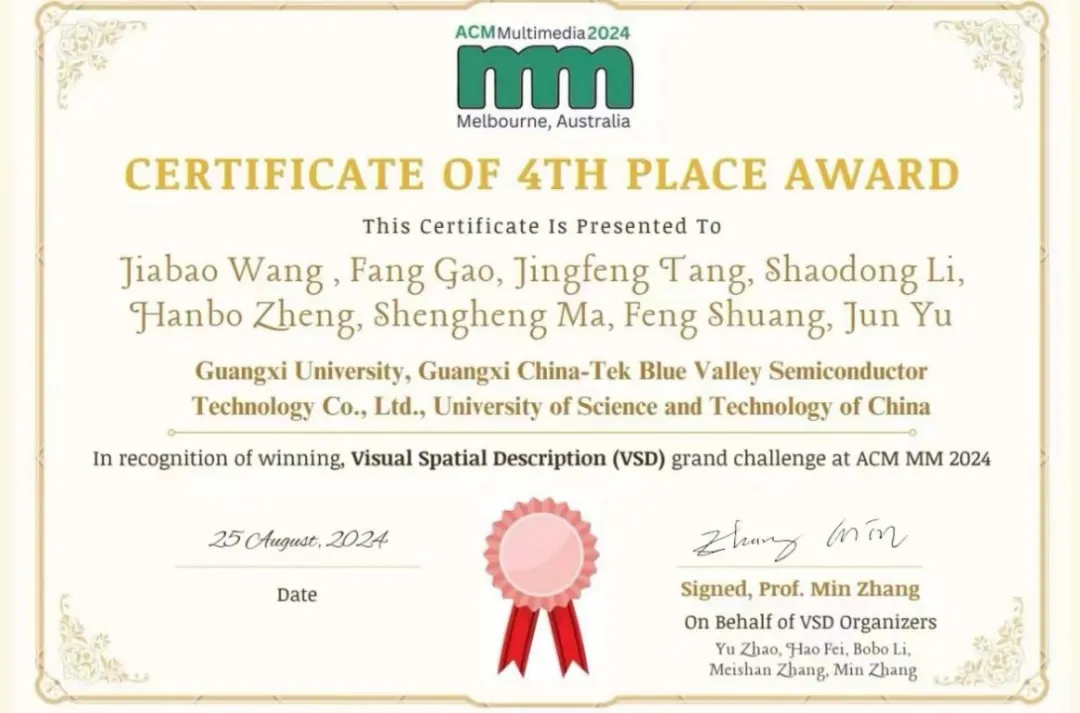 近日,第32屆ACM國際多媒體會議在澳大利亞墨爾本落下帷幕。該會議由美國計算機學(xué)會(Association for Computing Machinery,簡稱ACM)主辦,同時其主辦?的視覺空間描述重大挑戰(zhàn)(Grand Challenge: Visual Spatial Description,簡稱VSD2024)公布競賽結(jié)果并頒發(fā)獲獎證書。?我院廣西電力裝備智能控制與運維重點實驗室高放教授帶領(lǐng)的GXU-LIPE團隊榮獲挑戰(zhàn)賽第四名,同時受邀撰寫論文并進行口頭報告。 所獲獎狀 ACM Multimedia是由美國計算機學(xué)會主辦的計算機視覺和多媒體處理領(lǐng)域的頂級國際會議,也是中國計算機學(xué)會推薦的該領(lǐng)域A類國際學(xué)術(shù)會議。每年大會特設(shè)主題挑戰(zhàn)競賽(Grand Challenges),遴選自全球相關(guān)領(lǐng)域的前沿主題。 VSD2024屬于視覺空間語義理解的研究領(lǐng)域。在該挑戰(zhàn)賽中,模型需要生成一個準(zhǔn)確的文本描述句子,來描述輸入圖像中兩個給定目標(biāo)對象之間的空間關(guān)系。主辦方提供了一個大規(guī)模的視覺空間描述數(shù)據(jù)集,包含29,272個高質(zhì)量手動標(biāo)注的圖像—文本對。 GXU-LIPE團隊由高放教授和課題組研究生王家寶、唐鏡峰組成。團隊受邀撰寫了論文《A Method for Visual Spatial Description Based on Large Language Model Fine-tuning》發(fā)表在第32屆ACM國際多媒體會議,并前往墨爾本進行口頭報告。 科研團隊在做報告 GXU-LIPE團隊設(shè)計了一種創(chuàng)新的基于大模型的方法,通過微調(diào)大語言模型FLANXXL提升了視覺空間關(guān)系描述的效果。首先通過預(yù)訓(xùn)練模型提取圖像特征和文本特征,然后采用Q-former進行特征融合,最終通過大語言模型輸出文本描述。為解決LLM特征捕獲困難的問題,將原始特征與融合后的特征一并輸入FLANXXL,并采用數(shù)據(jù)增強、先驗知識和多種訓(xùn)練策略等進行微調(diào),具體包括提升文本多樣性、引入對象重疊先驗、基于動量蒸餾篩選難負樣本及生成軟標(biāo)簽,基于權(quán)重平衡長尾數(shù)據(jù)等。通過多模態(tài)特征融合和微調(diào),模型在挑戰(zhàn)賽測試集上表現(xiàn)優(yōu)異,生成了準(zhǔn)確且更真實的對象空間關(guān)系描述文本。 概念圖 本次參加ACM MM會議由廣西大學(xué)“2024年研究生素質(zhì)能力提升項目”資助,為LIPE重點實驗室提供了寶貴的國際交流機會,提升在視覺語言處理、多模態(tài)融合、人工智能等領(lǐng)域的科研能力。王家寶同學(xué)表示,在多媒體處理和計算機視覺應(yīng)用的快速發(fā)展背景下,此次參會有助于深入了解國際領(lǐng)先的研究動向、結(jié)識領(lǐng)域?qū)<遥楹罄m(xù)課題研究提供創(chuàng)新靈感和新的合作機會。