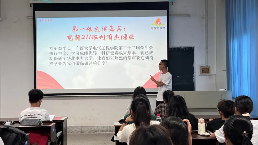 為深入學(xué)習(xí)宣傳貫徹黨的教育方針,積極響應(yīng)習(xí)近平總書(shū)記關(guān)于青年成長(zhǎng)成才的重要論述,幫助廣大青年學(xué)子全面理解保研、考研的實(shí)踐路徑,明確個(gè)人職業(yè)規(guī)劃,激發(fā)內(nèi)在潛能與斗志,11月19日,我院在學(xué)院304教室開(kāi)展“青春?jiǎn)⒑剑罕?/span>研之路的經(jīng)驗(yàn)之光”主題青春思享薈活動(dòng)。本次活動(dòng)由共青團(tuán)廣西大學(xué)委員會(huì)主辦,共青團(tuán)廣西大學(xué)電氣工程學(xué)院委員會(huì)承辦,院學(xué)生會(huì)策劃開(kāi)展,學(xué)院團(tuán)委、學(xué)生會(huì)骨干參加活動(dòng)。 01 第一位青春宣講人-劉洧杰 劉洧杰,廣西大學(xué)電氣工程學(xué)院第二十二屆學(xué)生會(huì)執(zhí)行主席,學(xué)習(xí)成績(jī)優(yōu)異,科研競(jìng)賽成果豐富,現(xiàn)已成功保研至華北電力大學(xué)。劉洧杰同學(xué)分享了從考研備考到保研成功的過(guò)程,強(qiáng)調(diào)了保研之路中“硬實(shí)力”與“軟實(shí)力”并重的關(guān)鍵性。他提到,在致力于提高學(xué)業(yè)成績(jī)、鞏固學(xué)術(shù)基礎(chǔ)、追求競(jìng)賽獲獎(jiǎng)以及高分通過(guò)六級(jí)英語(yǔ)考試這些“硬實(shí)力”的同時(shí),也應(yīng)充分利用在學(xué)生組織中的工作經(jīng)驗(yàn)這一“軟實(shí)力”,以全方位提升個(gè)人的綜合競(jìng)爭(zhēng)力。 劉洧杰同學(xué) 02 第二位青春宣講人-羅彬 羅彬,廣西大學(xué)電氣工程學(xué)院第十八屆學(xué)生團(tuán)委副書(shū)記,成績(jī)優(yōu)異,積極參與學(xué)生活動(dòng),有效平衡工作與學(xué)習(xí),現(xiàn)已保研至湖南大學(xué)。羅彬同學(xué)著重闡述了參加夏令營(yíng)與預(yù)推免的關(guān)鍵作用,強(qiáng)調(diào)了維持優(yōu)異成績(jī)的必要性,同時(shí)提供了選擇導(dǎo)師與學(xué)校的寶貴建議。他指出,保研過(guò)程中需平衡學(xué)業(yè)與課外活動(dòng),積極籌備面試,并明智地挑選目標(biāo)院校與導(dǎo)師。羅彬還鼓勵(lì)道,保研之路并非一帆風(fēng)順,要以平常心面對(duì),只要持之以恒,終將渡過(guò)難關(guān)。 羅彬同學(xué) 此次活動(dòng),是學(xué)院推動(dòng)學(xué)風(fēng)建設(shè)而采取的行動(dòng),為青年學(xué)子搭建了一個(gè)信息交流、經(jīng)驗(yàn)傳遞的平臺(tái),助力低年級(jí)同學(xué)們在學(xué)術(shù)深造與未來(lái)規(guī)劃的道路上邁出更加堅(jiān)實(shí)的一步。