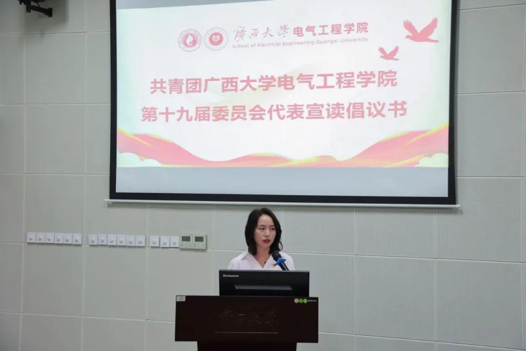 2024年11月26日下午,共青團(tuán)廣西大學(xué)電氣工程學(xué)院第十九次代表大會(huì)在第六教學(xué)樓六二階教室召開(kāi)。校黨委學(xué)工部(處)部(處)長(zhǎng)、校團(tuán)委書(shū)記謝能重,學(xué)院黨委書(shū)記梁志堅(jiān),院長(zhǎng)武新章,學(xué)院黨委副書(shū)記、副院長(zhǎng)劉輝,學(xué)院黨委副書(shū)記李道洋,副院長(zhǎng)李畸勇、鄭天和,計(jì)算機(jī)與電子信息學(xué)院團(tuán)委書(shū)記楊洋,電氣工程學(xué)院團(tuán)委副書(shū)記蔣冬連、李娟,兼職團(tuán)委副書(shū)記李勇,學(xué)院輔導(dǎo)員及兄弟學(xué)院團(tuán)委代表,以及學(xué)院團(tuán)員代表參加本次大會(huì)。大會(huì)由馮敏老師和劉家成同學(xué)主持。