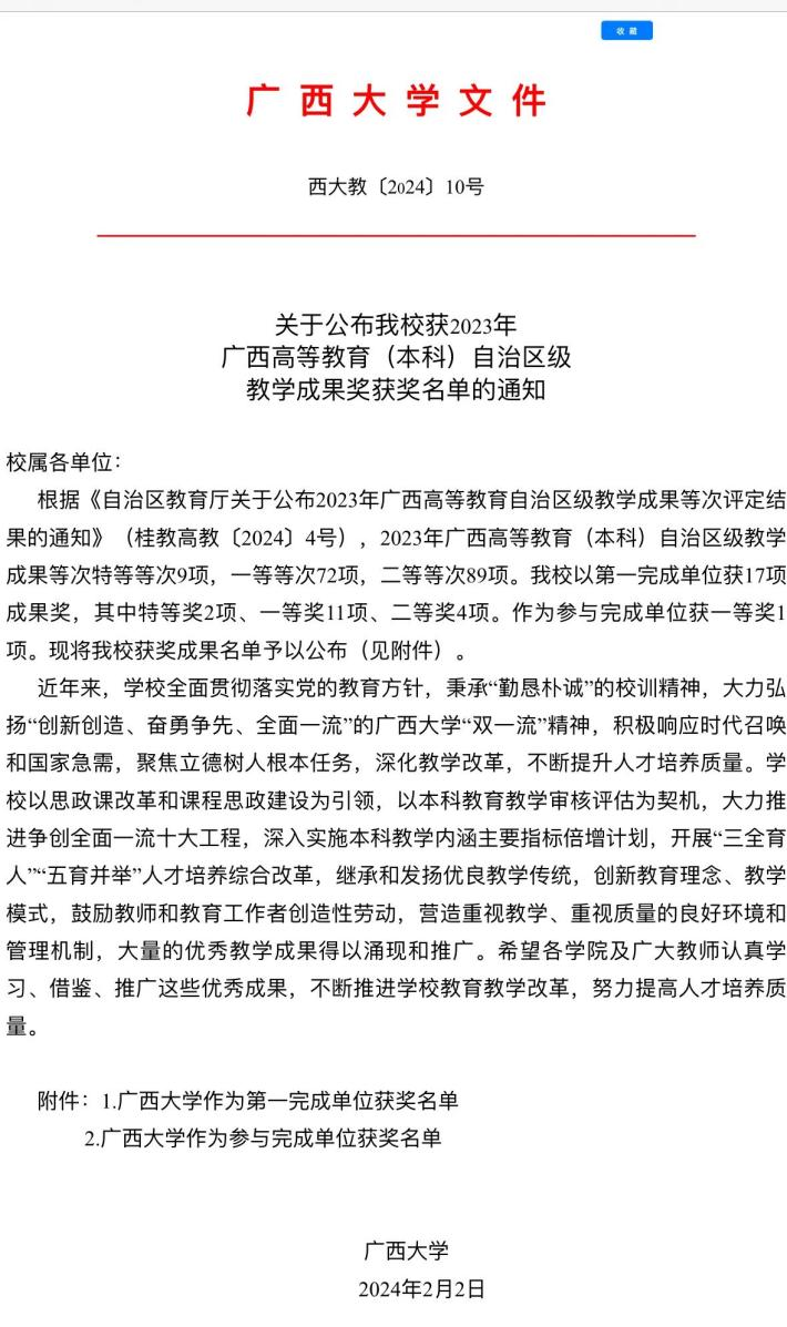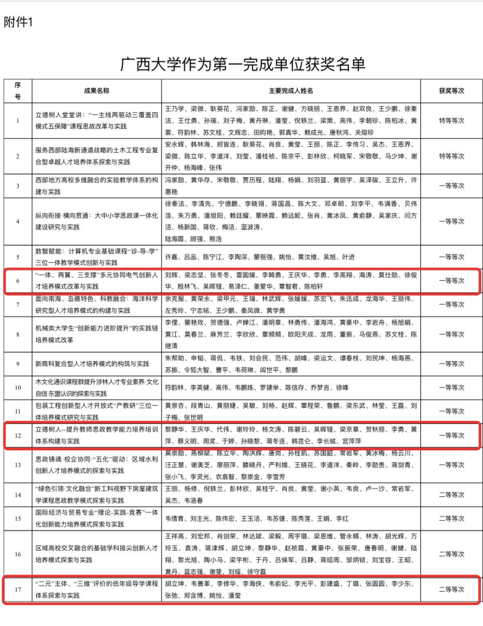 我院喜獲三項2023年廣西高等教育(本科)自治區(qū)級教學成果獎,劉輝副院長、黎靜華教授的主持項目均獲得一等獎,胡立坤教授主持項目獲得二等獎。