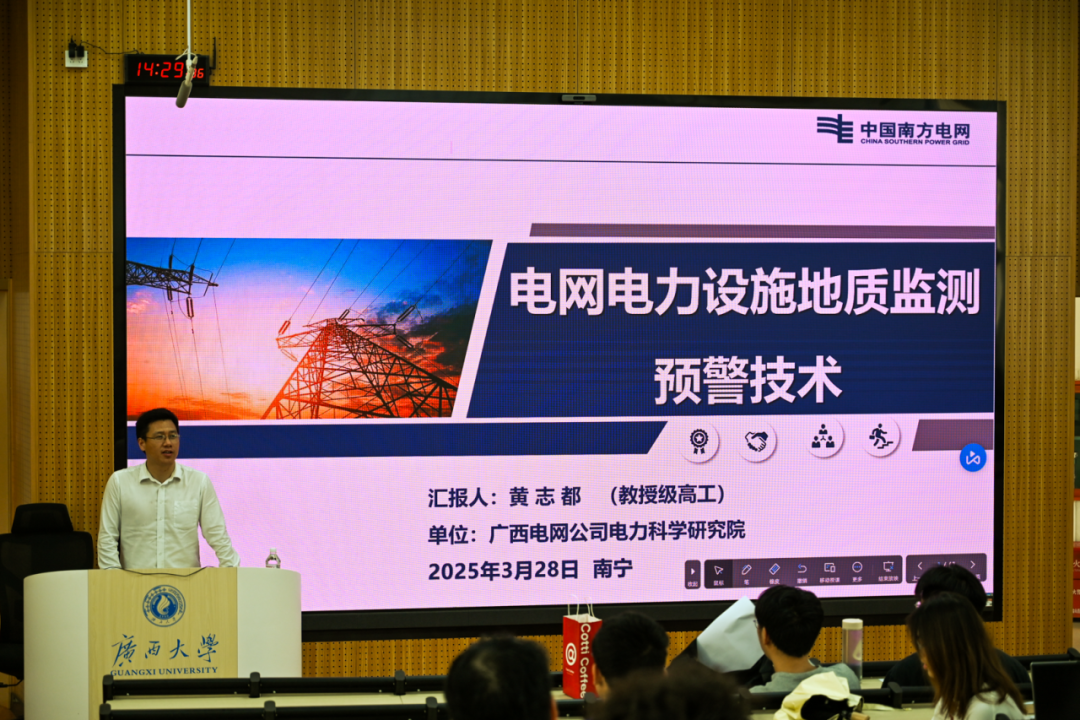 為提升我院學(xué)生工程應(yīng)用與實(shí)踐能力,了解當(dāng)下科研工作前沿,助力其成長成才,3月28日下午,我院在東10A-305教室舉行第7期“行業(yè)大咖進(jìn)課堂”暨電氣工程學(xué)科前沿講座。廣西電網(wǎng)公司電力科學(xué)研究院教授級高工黃志都受邀到我院為師生們作題為“電網(wǎng)地質(zhì)災(zāi)害監(jiān)測預(yù)警技術(shù)”的講座,我院2024級電氣工程專業(yè)全體博士、碩士及部分本科生共250余人參與講座。 黃志都高工正在授課 講座伊始,黃志都高工從電網(wǎng)輸電通道周邊地質(zhì)災(zāi)害情況切入,迅速吸引了同學(xué)們的注意力。隨后,他講述了基于北斗衛(wèi)星和微波遙感(InSAR)兩種技術(shù)手段的應(yīng)用方法,此方法能同時(shí)按照“單體監(jiān)測、廣域監(jiān)測”兩種尺度實(shí)現(xiàn)輸變電設(shè)施地質(zhì)災(zāi)害大范圍探測、小范圍監(jiān)測立體化監(jiān)測預(yù)警體系,并能夠?qū)崿F(xiàn)三維可視化展示。 黃志都高工介紹電網(wǎng)地災(zāi)情況 其中,InSAR遙感監(jiān)測技術(shù)的特點(diǎn)在于設(shè)計(jì)了輸變電設(shè)施地質(zhì)災(zāi)害監(jiān)測系統(tǒng)的架構(gòu),包括北斗實(shí)時(shí)單體監(jiān)測、遙感InSAR局域監(jiān)測和輸電桿塔三維可視化這三大基本模塊。黃志都高工結(jié)合廣西電網(wǎng)歷史地質(zhì)災(zāi)害情況,向同學(xué)們深入講解了InSAR遙感監(jiān)測的具體應(yīng)用案例,并清晰地展現(xiàn)了InSAR遙感監(jiān)測手段能夠針對每個(gè)遙感點(diǎn)生成不同顏色的標(biāo)識,以及相關(guān)地形變化數(shù)據(jù)和曲線。 同學(xué)們認(rèn)真聽課與做筆記 此次講座不僅拓寬了同學(xué)們的學(xué)術(shù)視野,激發(fā)了同學(xué)們對前沿技術(shù)的濃厚興趣和深入探索的動力。同時(shí),黃志都高工關(guān)于實(shí)踐經(jīng)驗(yàn)與行業(yè)洞察的分享,也為同學(xué)們未來的職業(yè)規(guī)劃提供了寶貴的指導(dǎo)和啟發(fā)。未來,學(xué)院將繼續(xù)開展“行業(yè)大咖進(jìn)課堂”系列活動,通過持續(xù)深化校企合作課程體系建設(shè),推動產(chǎn)學(xué)研協(xié)同發(fā)展,共同打造科技創(chuàng)新與高素質(zhì)人才培養(yǎng)的雙贏格局。