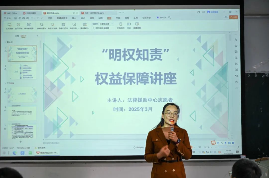 在 “勞動(dòng)者權(quán)益保障” 主題分享環(huán)節(jié),農(nóng)瑋琳為同學(xué)們系統(tǒng)解讀了有關(guān)三方協(xié)議的知識(shí),著重點(diǎn)明了簽訂三方協(xié)議時(shí)的注意事項(xiàng)。隨后,她借助視頻等形式,為同學(xué)們普及了勞動(dòng)合同審查與解除、薪資問題以及勞動(dòng)爭議解決方式等法律知識(shí),同時(shí)提醒同學(xué)們在未來求職過程中要擦亮雙眼,勇于捍衛(wèi)自己作為勞動(dòng)者的合法權(quán)益。