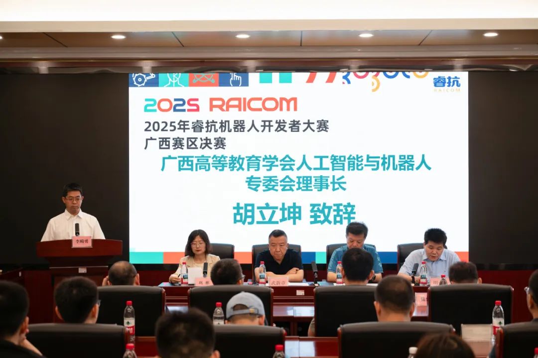 廣西高等教育學會人工智能與機器人專委會理事長、廣西大學教師發(fā)展中心專職副主任胡立坤在發(fā)言中介紹了本屆賽事參與情況。本次區(qū)賽共吸引36所院校403支隊伍參賽,最終281支隊伍參加廣西賽區(qū)決賽,期待各方在賽事中深化交流、共促產業(yè)進步。