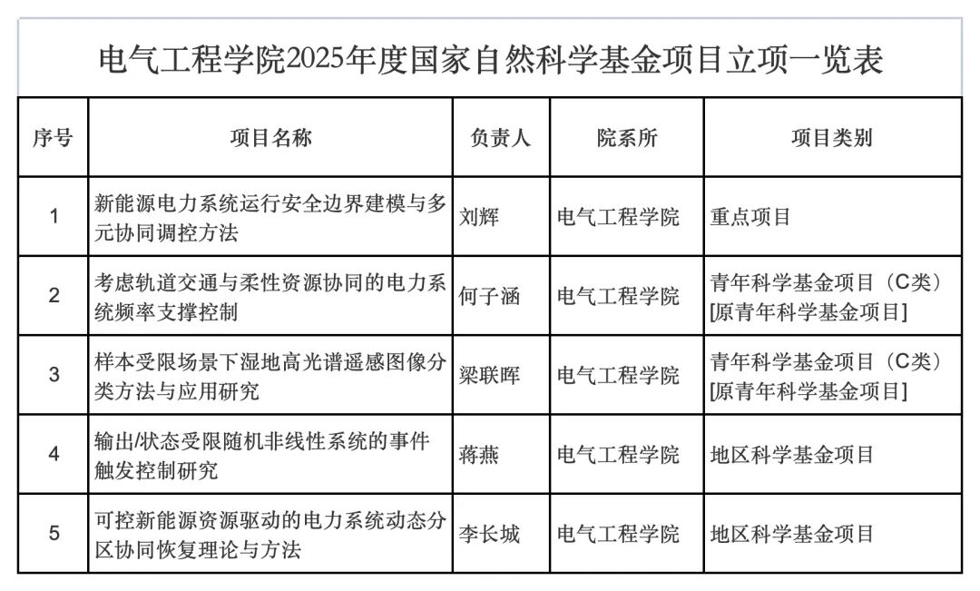 8月27日,國家自然科學(xué)基金委員會發(fā)布《關(guān)于2025年國家自然科學(xué)基金集中接收申請項(xiàng)目評審結(jié)果的通告》。我院在此次申報(bào)中喜獲豐收,共獲批項(xiàng)目5項(xiàng),包括1項(xiàng)重點(diǎn)項(xiàng)目、2項(xiàng)青年科學(xué)基金項(xiàng)目和2項(xiàng)地區(qū)科學(xué)基金項(xiàng)目,合計(jì)資助總額355萬元。其中重點(diǎn)項(xiàng)目的獲批實(shí)現(xiàn)了我院歷史性突破——這是我院首次獲得國家自然科學(xué)基金重點(diǎn)項(xiàng)目資助,也是本年度我校唯一獲批的重點(diǎn)項(xiàng)目。 項(xiàng)目立項(xiàng)一覽表 此次獲批的重點(diǎn)項(xiàng)目“新能源電力系統(tǒng)運(yùn)行安全邊界建模與多元協(xié)同調(diào)控方法”,由我院自主培養(yǎng)的國家級高層次人才、學(xué)院黨委副書記、副院長劉輝教授主持,獲資助經(jīng)費(fèi)230萬元。項(xiàng)目旨在解決“雙碳”目標(biāo)下新能源電力系統(tǒng)面臨的兩大關(guān)鍵科學(xué)問題:多類型資源差異化爬坡能力的時(shí)空協(xié)同機(jī)理不明,以及多重不確定性下系統(tǒng)運(yùn)行安全邊界難以精確辨識。研究團(tuán)隊(duì)將圍繞高比例新能源接入電網(wǎng)帶來的安全運(yùn)行與高效消納難題開展前沿研究,采用數(shù)學(xué)解析與仿真建模相結(jié)合的手段,重點(diǎn)突破源荷儲協(xié)同爬坡能力建模、系統(tǒng)運(yùn)行安全邊界動態(tài)辨識、時(shí)空耦合備用優(yōu)化和風(fēng)險(xiǎn)約束緊急調(diào)度等關(guān)鍵技術(shù),為構(gòu)建安全高效的新型電力系統(tǒng)提供關(guān)鍵理論和技術(shù)支撐。此前,劉輝教授已于2020年主持國家重點(diǎn)研發(fā)計(jì)劃政府間國際科技創(chuàng)新合作重點(diǎn)專項(xiàng)(國撥經(jīng)費(fèi)303萬元),此次再牽頭國家級重點(diǎn)項(xiàng)目,彰顯其團(tuán)隊(duì)在新能源電力系統(tǒng)領(lǐng)域的持續(xù)創(chuàng)新能力與行業(yè)學(xué)術(shù)影響力。 十四五以來,學(xué)院已累計(jì)承擔(dān)國家級項(xiàng)目34項(xiàng),奠定了雄厚的科研根基。正是在這一數(shù)量的堅(jiān)實(shí)積累之上,迎來了此次重點(diǎn)項(xiàng)目“質(zhì)”的飛躍。 作為衡量科研實(shí)力與學(xué)術(shù)水平的核心標(biāo)志,國家自然科學(xué)基金重點(diǎn)項(xiàng)目的獲批將進(jìn)一步推動我院電氣工程專業(yè)學(xué)科的高質(zhì)量發(fā)展,為我國新能源電力系統(tǒng)安全穩(wěn)定運(yùn)行、新能源高效消納提供堅(jiān)實(shí)保障,更將為國家“雙碳”重大戰(zhàn)略目標(biāo)的實(shí)現(xiàn)注入強(qiáng)勁科研動能。