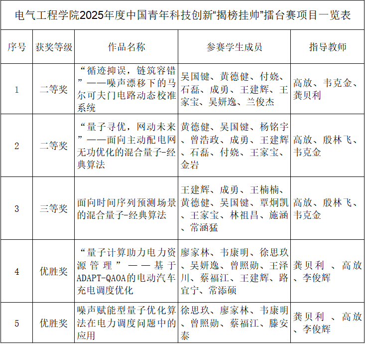 2025年度中國(guó)青年科技創(chuàng)新“揭榜掛帥”擂臺(tái)賽新一代信息技術(shù)領(lǐng)域主擂臺(tái)賽終審于10月26日至28日在西部科學(xué)城重慶高新區(qū)舉行。經(jīng)過(guò)激烈角逐,我院參賽團(tuán)隊(duì)發(fā)揮出色,最終榮獲二等獎(jiǎng)2項(xiàng)、三等獎(jiǎng)1項(xiàng)、優(yōu)勝獎(jiǎng)2項(xiàng),充分展現(xiàn)了我院青年學(xué)子扎實(shí)的專業(yè)功底和活躍的科技創(chuàng)新實(shí)力。 一直以來(lái),學(xué)院高度重視學(xué)生科技創(chuàng)新能力培養(yǎng),始終堅(jiān)持以賽促學(xué)、以賽促創(chuàng)的理念。依托學(xué)科特色和專業(yè)優(yōu)勢(shì),積極搭建科研訓(xùn)練平臺(tái),整合校內(nèi)外優(yōu)質(zhì)資源,為參賽團(tuán)隊(duì)提供專業(yè)指導(dǎo)。從電氣工程領(lǐng)域相關(guān)項(xiàng)目的選題孵化、多學(xué)科交叉團(tuán)隊(duì)的組建,到賽前系統(tǒng)的技術(shù)培訓(xùn)與模擬演練,學(xué)院在電力系統(tǒng)、新能源技術(shù)、智能控制等方向給予全方位支持,為學(xué)生的科研探索與創(chuàng)新實(shí)踐提供堅(jiān)實(shí)保障。 本次參賽項(xiàng)目均聚焦量子科技核心領(lǐng)域,圍繞量子計(jì)算技術(shù)攻關(guān)與場(chǎng)景應(yīng)用展開(kāi),對(duì)接國(guó)家“十五五”規(guī)劃重點(diǎn)產(chǎn)業(yè)布局。量子科技是國(guó)家“十五五”核心發(fā)展方向,我院擁有扎實(shí)的研究積淀,并依托前沿量子技術(shù)突破形成創(chuàng)新勢(shì)能;在競(jìng)賽培育中,我院統(tǒng)籌資源、強(qiáng)化專業(yè)指導(dǎo),力爭(zhēng)持續(xù)產(chǎn)出高水平競(jìng)賽成果。 項(xiàng)目介紹 本屆賽事由共青團(tuán)中央聯(lián)合中國(guó)科協(xié)等五部委共同主辦,共青團(tuán)重慶市委和重慶高新區(qū)管委會(huì)承辦,以“企業(yè)出題、青年破題”為機(jī)制,聚焦芯片設(shè)計(jì)、量子算法、空天互聯(lián)等關(guān)鍵領(lǐng)域,精準(zhǔn)發(fā)布21項(xiàng)技術(shù)難題,推動(dòng)產(chǎn)學(xué)研深度融合的創(chuàng)新閉環(huán)。該擂臺(tái)賽不僅為青年科技人才提供了展示創(chuàng)新能力的國(guó)家級(jí)平臺(tái),更有力推動(dòng)了區(qū)域產(chǎn)業(yè)升級(jí)與新質(zhì)生產(chǎn)力培育,為加快建成具有全國(guó)影響力的科技創(chuàng)新中心注入青春動(dòng)能。 據(jù)悉,此次賽事共吸引全國(guó)378所高校的1200余支團(tuán)隊(duì)及50余支青年科技人才團(tuán)隊(duì)報(bào)名。經(jīng)初審,500余支優(yōu)秀團(tuán)隊(duì)晉級(jí)終審。終審將評(píng)選出多名“擂主”,發(fā)榜單位不僅提供總額逾500萬(wàn)元的獎(jiǎng)金池,還將為優(yōu)勝方案提供產(chǎn)業(yè)化對(duì)接機(jī)會(huì),切實(shí)推動(dòng)科技成果轉(zhuǎn)化。 未來(lái),學(xué)院將繼續(xù)深化與電力企業(yè)、能源集團(tuán)的產(chǎn)學(xué)研合作,不斷豐富學(xué)生在電氣工程領(lǐng)域的實(shí)戰(zhàn)經(jīng)驗(yàn),孵化更多技術(shù)領(lǐng)先、應(yīng)用性強(qiáng)的高水平項(xiàng)目,全面提升學(xué)生的創(chuàng)新創(chuàng)業(yè)能力,努力培養(yǎng)更多適應(yīng)行業(yè)發(fā)展需求、具備創(chuàng)新精神和實(shí)踐能力的高素質(zhì)人才。 參賽選手合影