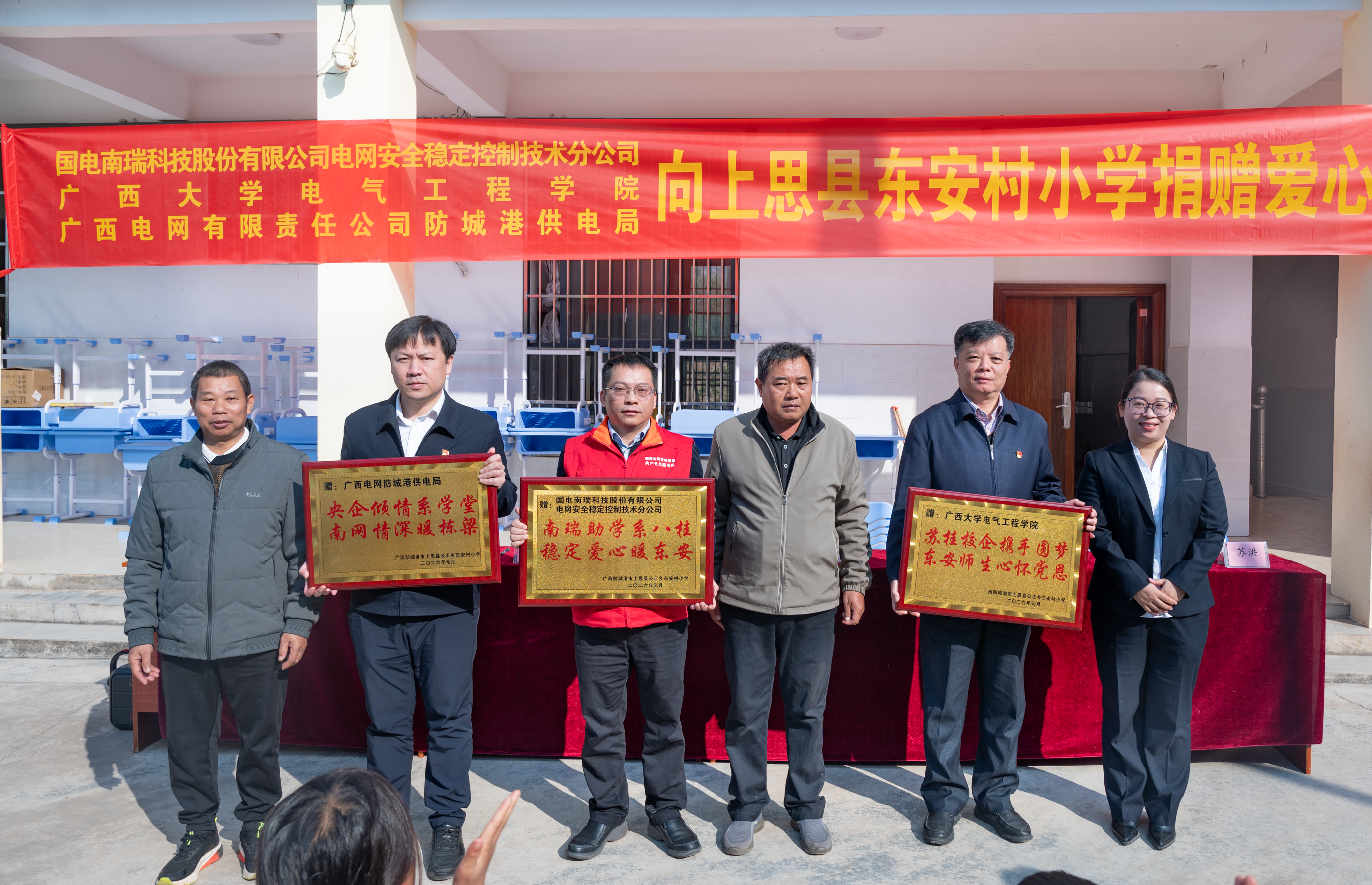 近日,我院聯(lián)合國(guó)電南瑞科技股份有限公司電網(wǎng)安全穩(wěn)定控制技術(shù)分公司(以下簡(jiǎn)稱(chēng)“國(guó)電南瑞穩(wěn)定公司”)、南方電網(wǎng)廣西防城港供電局,赴上思縣東安村小學(xué)、寧明縣那楠鄉(xiāng)中心小學(xué)開(kāi)展愛(ài)心助學(xué)活動(dòng)。校企三方以物資捐贈(zèng)、知識(shí)分享、交流互動(dòng)等形式,為鄉(xiāng)村教育發(fā)展注入溫暖力量,以實(shí)際行動(dòng)助力鄉(xiāng)村振興。