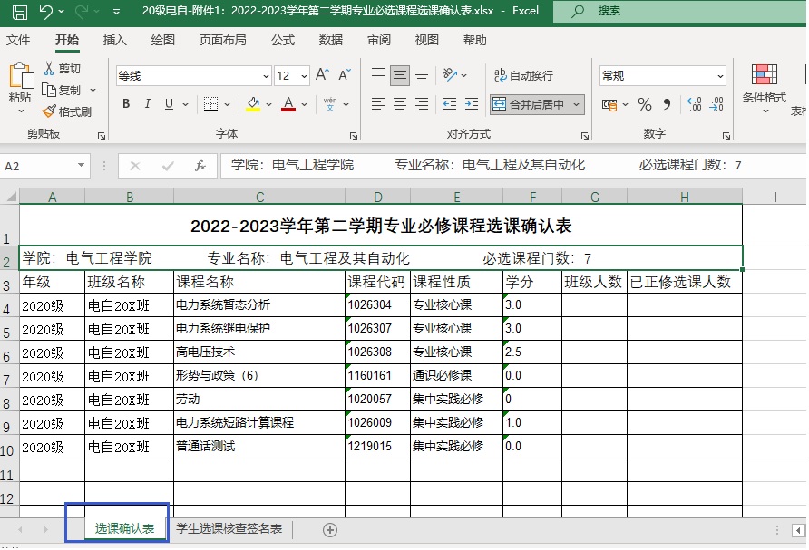 1、按通知要求教學(xué)辦已經(jīng)填寫各年級(jí)、專業(yè)《2022-2023學(xué)年第二學(xué)期專業(yè)必修課程選課確認(rèn)表》,見(jiàn)附件。各同學(xué)下載對(duì)照核查自己的選課。如下圖
