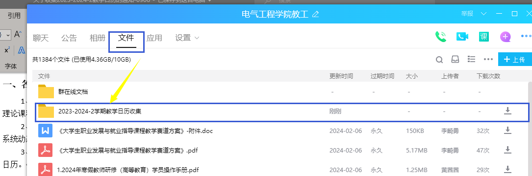 (2)收集方式:進教工QQ群界面—文件—教學日歷(2023-2024-2)文件夾—上傳