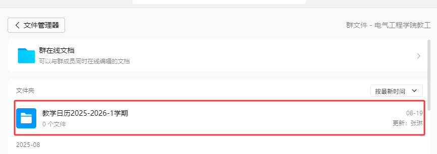 (1)命名格式:教學(xué)日歷(2025-2026-1)+任課教師+課程名(與教務(wù)系統(tǒng)一致的全稱)+(教學(xué)班)。上傳到學(xué)院教工群文件夾:教學(xué)日歷2025-20261。