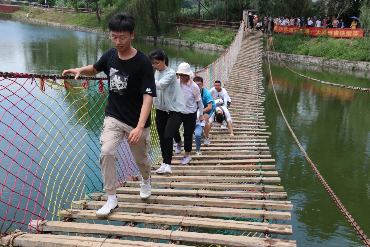 時光匆匆,轉(zhuǎn)眼便來到了下午。在教官的帶領(lǐng)下,一行人來到了“飛奪瀘定橋”的體驗地點。一眼望去,映入眼簾的便是幾條鐵索在空中搖蕩,只有幾塊木板交替搭建在鐵索之中。隊伍依次前行,渡橋搖搖晃晃,底下便是湖泊,仿佛回到了當(dāng)年紅軍飛奪瀘定橋的場景,在敵人的火力里,冒死搭橋,“大渡橋橫鐵索寒”。艱難爬過“瀘定橋”之后,心中對老紅軍的敬佩之情油然而生,實際地體會到了何為“長征精神”。