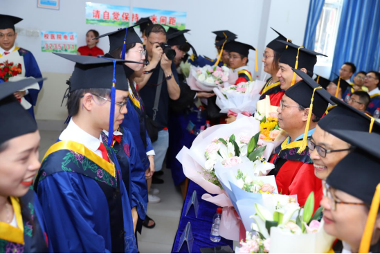 學位授予儀式開始前,畢業(yè)生們向?qū)煫I上鮮花,表達對恩師培育的感謝與敬意。
