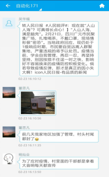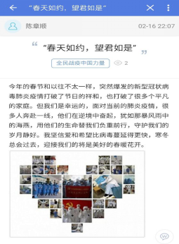 自171班:我們一起戰(zhàn)“疫”,形成中國(guó)力量,有你我有他。本次學(xué)習(xí)是通過(guò)易班上傳和分享疫情防控中的先進(jìn)典型、動(dòng)人故事和感人語(yǔ)錄,創(chuàng)建班級(jí)群進(jìn)行相關(guān)看法以及觀點(diǎn)的交流學(xué)習(xí)。一、線上討論交流。由班委做好表率,率先起頭,引起話題,然后同學(xué)們參與討論與交流,同學(xué)們積極表現(xiàn),時(shí)常在群里面上傳自己所關(guān)注疫情的相關(guān)動(dòng)態(tài),引發(fā)同學(xué)們討論與學(xué)習(xí),同學(xué)們積極發(fā)言,并在易班內(nèi)部的微社區(qū)全民戰(zhàn)疫板塊積極發(fā)表自己想法。關(guān)注疫情的同時(shí)也進(jìn)一步提高了自我對(duì)疫情防控的重要認(rèn)識(shí)。