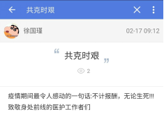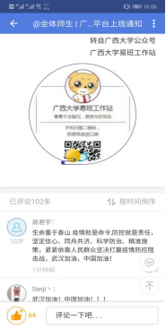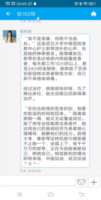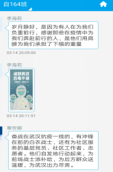 自164班:我們班在易班中開(kāi)設(shè)“網(wǎng)上班級(jí)”,通過(guò)易班組織網(wǎng)上主題班會(huì)、網(wǎng)上組織生活,討論觀后感、學(xué)習(xí)心得和個(gè)人思考。開(kāi)展“一句話”“一個(gè)人”“一個(gè)舉動(dòng)”“一個(gè)場(chǎng)景”“一個(gè)視頻”“一個(gè)群體”等交流活動(dòng),上傳和分享疫情防控中的先進(jìn)典型、動(dòng)人故事和感人語(yǔ)錄。同學(xué)們踴躍參與,積極討論,分享抗疫中的感人故事。如:覃同學(xué)接著分享了如下圖片,并感慨道:“奮戰(zhàn)在武漢抗疫一線的,有沖鋒在前的白衣戰(zhàn)士,還有為社區(qū)服務(wù)的基層黨員、社區(qū)工作者、志愿者。他們自發(fā)地行動(dòng)起來(lái),為前線戰(zhàn)士添補(bǔ)給,為后方群眾送溫暖,為武漢出力盡責(zé)。” 通過(guò)這次主題教育活動(dòng),同學(xué)們明白了作為一名大學(xué)生,防止新冠肺炎疫情向校園擴(kuò)散,每個(gè)人都有義不容辭的責(zé)任。疫情當(dāng)前,雖然很多同學(xué)因?yàn)楫厴I(yè)論文、答辯、實(shí)習(xí)工作等一系列問(wèn)題,迫切想要開(kāi)學(xué),但是在學(xué)校發(fā)出通知前一定不能提前返校,這不僅是對(duì)個(gè)人的不負(fù)責(zé),也是對(duì)大家生命安全的漠視。
