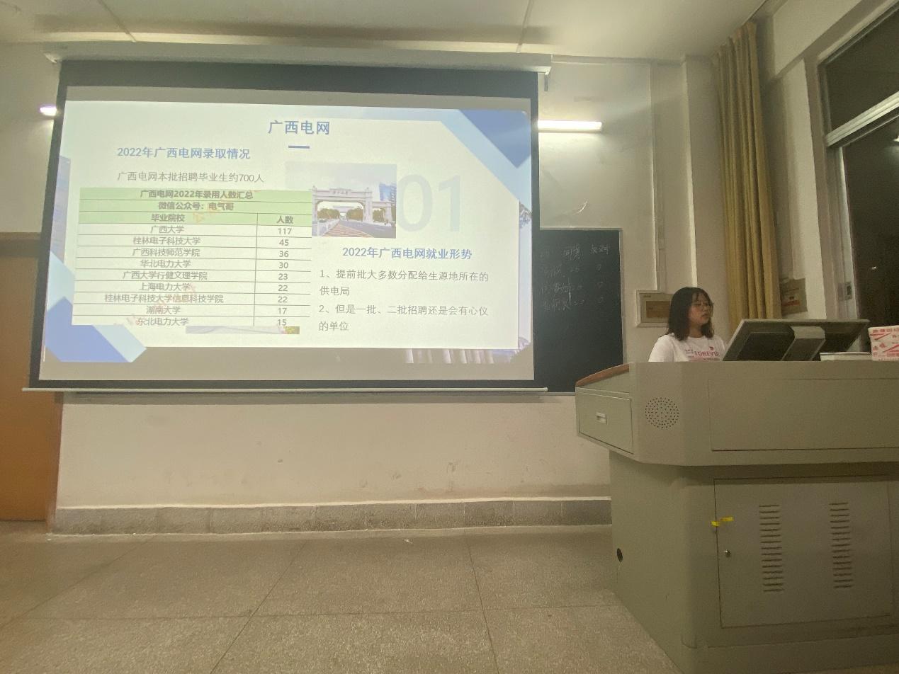 黃小倩同志已簽約南方電網(wǎng)南寧供電局,與我們分享了如何獲取就業(yè)信息、廣西電網(wǎng)招聘情況、廣西電網(wǎng)面試經(jīng)驗(yàn)、筆試經(jīng)驗(yàn)四個方面的內(nèi)容。談到如何獲取學(xué)校、學(xué)院發(fā)布的就業(yè)信息,黃小倩同志與我們分享了就業(yè)信息網(wǎng)和輔導(dǎo)員在群里發(fā)布的招聘信息兩個渠道,以及一些比較有用的微信公眾號。其次,黃小倩同志結(jié)合廣西電網(wǎng)的招聘情況和自身的面試過程,分享了如何在簡歷上突出個人優(yōu)勢,并叮囑求職者需要提前準(zhǔn)備面試問題以應(yīng)對考官提問。再者,黃小倩同志展示了部分面試時與考官的對話,告訴我們面試時需要注意的4個要求:1.不要緊張,實(shí)事求是。2.自我介紹流暢。3.善于表現(xiàn)自己的能力。4.謙遜、自信。最后,黃小倩同志分享了如何查找廣西電網(wǎng)公布的筆試信息、大綱,以及備考廣西電網(wǎng)筆試時需要提前準(zhǔn)備的資料。