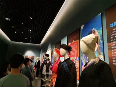 跟隨著博物館講解員的腳步,我們依次參觀了五彩八桂、霓裳羽衣、穿越時空的鼓聲、壯族文化展和百年老物件展等展廳。知曉了廣西境內山地丘陵綿延起伏,江河溪濱盤曲蜿蜒的地理風光,古往今來,各民族在這片山水如畫的土地上辛勤勞作,和諧共處,交流互鑒,因地制宜建造出獨具地方特色的壯美家園;欣賞了廣西十二個世居民族的服飾特點,其紡織工藝傳統(tǒng)古樸,世代傳承,如燦爛星空般不朽,它們?yōu)橹腥A服飾增添了無限光彩,展現(xiàn)出百變多樣的服飾特征與文化特色;還有參觀博物館征集的20世紀以來的老物件,立足于展柜前,看著這些老百姓身邊的物件,看似平凡普通,卻隱含深意,它們見證了波瀾壯闊的民族復興,承載著日新月異的社會變革,記錄了血肉豐滿的人生歷程。