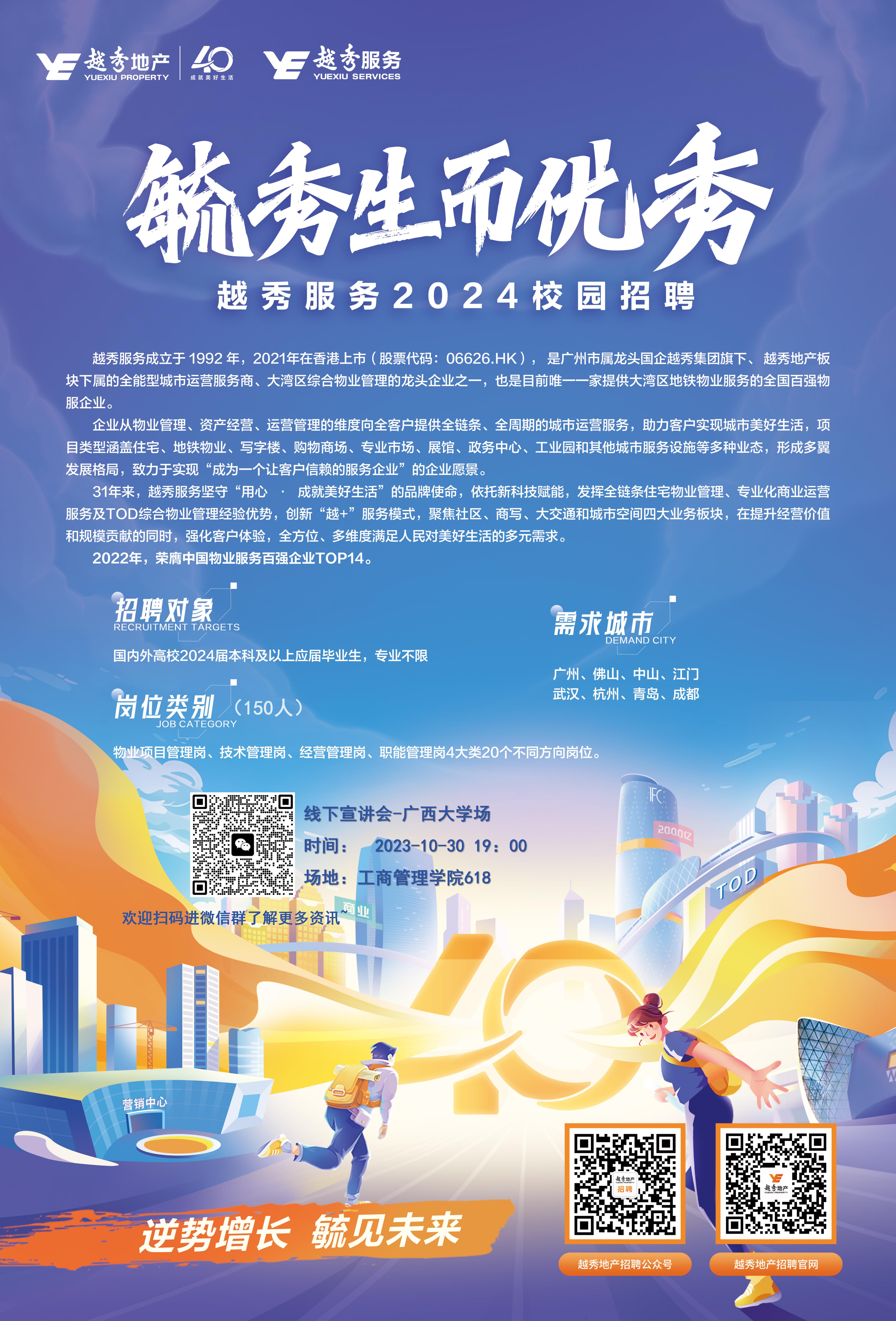 越秀服務(wù)2024年校園招聘約定你,更多信息可掃描二維碼進(jìn)群咨詢