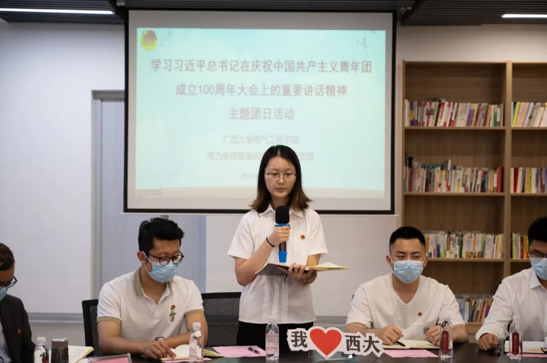 5月19日下午,我院功能型團(tuán)支部——電力系統(tǒng)智能調(diào)度與控制團(tuán)支部在大學(xué)生活動中心青年之家開展“學(xué)習(xí)習(xí)近平總書記在慶祝中國共產(chǎn)主義青年團(tuán)成立100周年大會上的重要講話精神”主題團(tuán)日活動。共青團(tuán)廣西區(qū)委副書記孫晉出席活動并講話。共青團(tuán)廣西區(qū)委組織部副部長、機(jī)關(guān)紀(jì)委書記周嵐,共青團(tuán)廣西大學(xué)委員會書記謝能重,第25屆“廣西青年五四獎?wù)隆鲍@得者、我院副院長黎靜華教授,我院全體團(tuán)委老師及電力系統(tǒng)智能調(diào)度與控制團(tuán)支部全體成員參加活動。