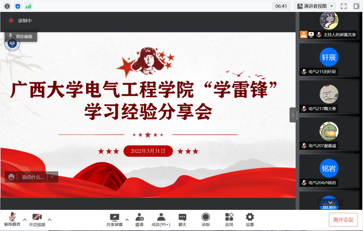 3月31日晚,我院以線上線下相結(jié)合的方式召開了“學(xué)雷鋒”學(xué)習(xí)經(jīng)驗分享會,本次會議分為學(xué)習(xí)方法指導(dǎo)、“學(xué)長學(xué)姐有話說”、“解惑答疑”三個環(huán)節(jié)。我院覃思老師,盧泉老師,殷林飛老師就如何高效掌握課程知識進行學(xué)習(xí)方法指導(dǎo)。創(chuàng)培181班隆承雨,電自188班王延州,創(chuàng)培191班周璐梅、范協(xié)洋、趙澤辰,自動化192班李秋君作“學(xué)長學(xué)姐有話說” 的經(jīng)驗分享,全體2020級、2021級本科生參加會議。