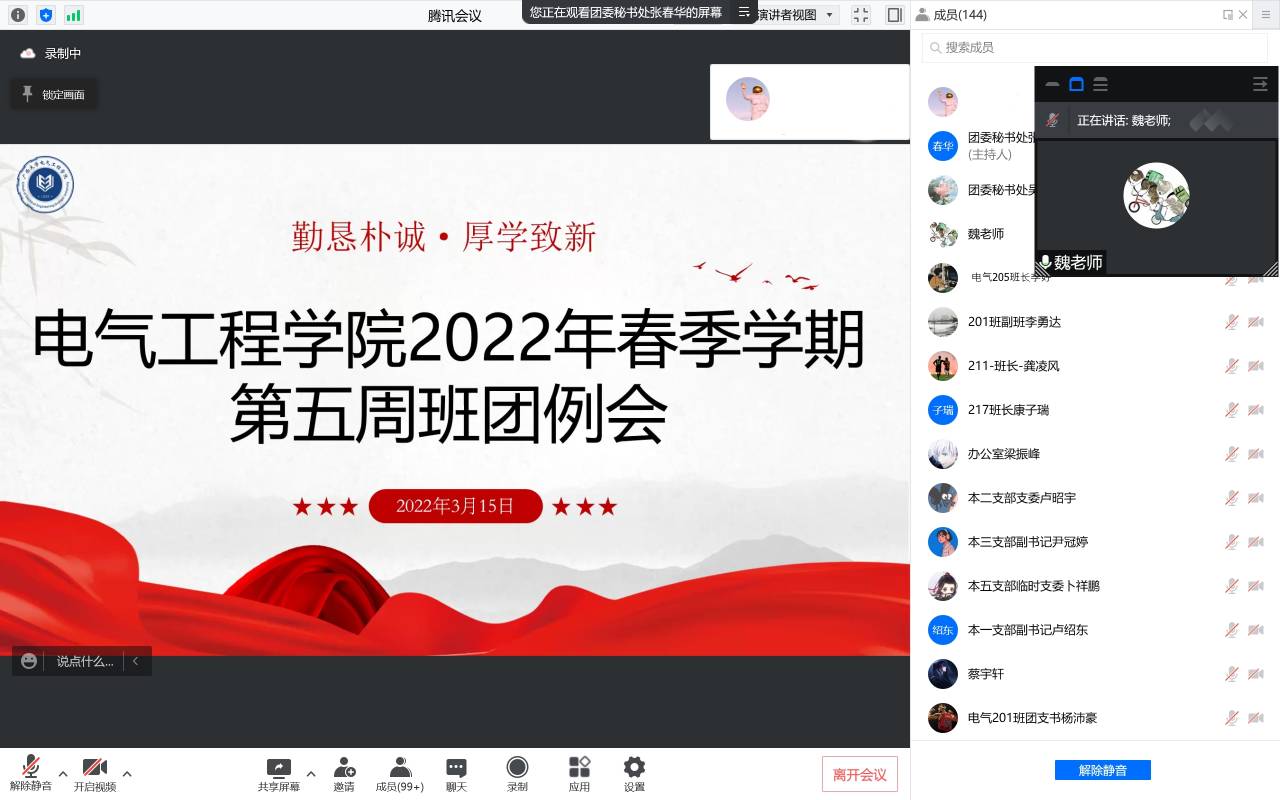 為提高學(xué)生的疫情防護(hù)意識(shí),保障學(xué)生的自身健康安全,同時(shí)激勵(lì)學(xué)生干部,為新學(xué)期做好全新的準(zhǔn)備,電氣工程學(xué)院于3月15日下午召開(kāi)2021-2022學(xué)年春季學(xué)期全體學(xué)生干部大會(huì)。本次會(huì)議采用線(xiàn)上視頻會(huì)議的形式開(kāi)展,學(xué)院黨委副書(shū)記雷圓媛、團(tuán)委書(shū)記石建有、團(tuán)委副書(shū)記蔣冬連、全體輔導(dǎo)員和全體學(xué)生干部參加會(huì)議。