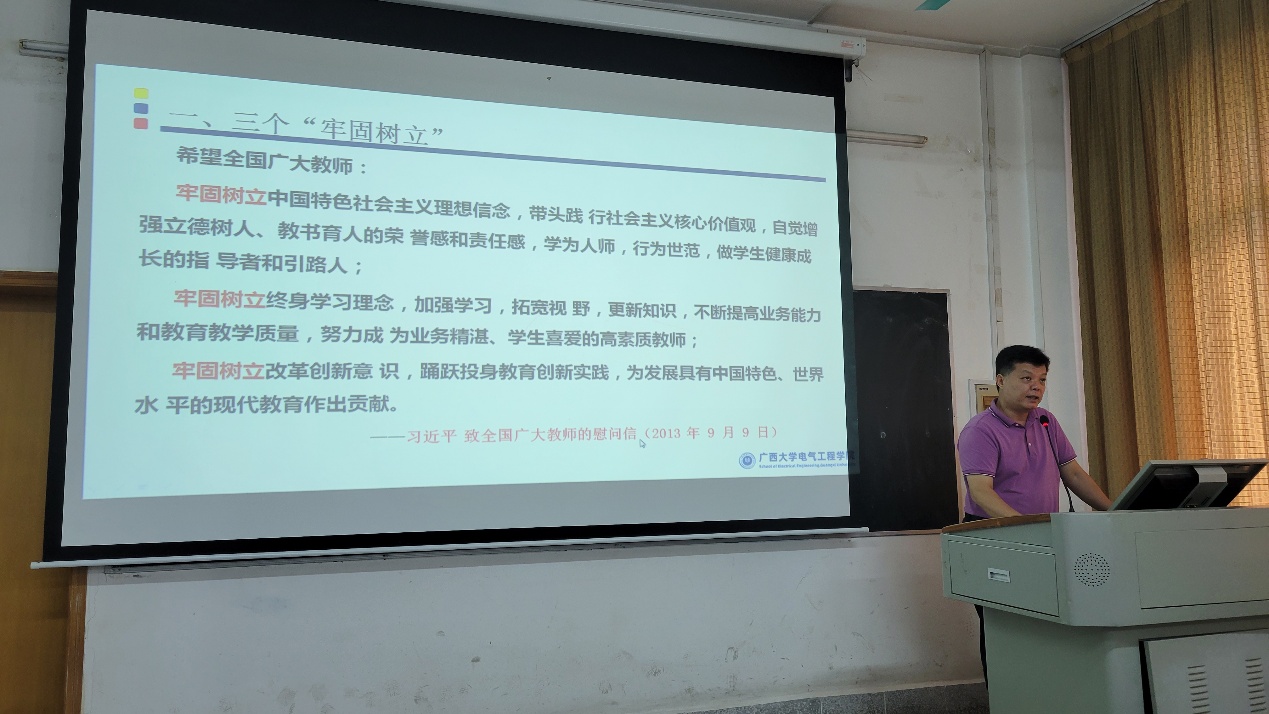 院黨委副書記梁志堅(jiān)作師德師風(fēng)專題教育,強(qiáng)調(diào)師德師風(fēng)是評(píng)價(jià)教師隊(duì)伍素質(zhì)的第一標(biāo)準(zhǔn)。對(duì)習(xí)近平總書記關(guān)于師德師風(fēng)的重要論述,“四史”學(xué)習(xí)教育資料和新時(shí)代師德規(guī)范等進(jìn)行了解讀,以師德優(yōu)秀典型為榜樣引領(lǐng)踐行高尚師德,以師德警示教育案例強(qiáng)化職業(yè)行為準(zhǔn)則意識(shí)。此外,梁副書記還介紹了學(xué)院的紀(jì)委工作,監(jiān)督推進(jìn)全面從嚴(yán)治黨、加強(qiáng)黨風(fēng)廉政建設(shè)。