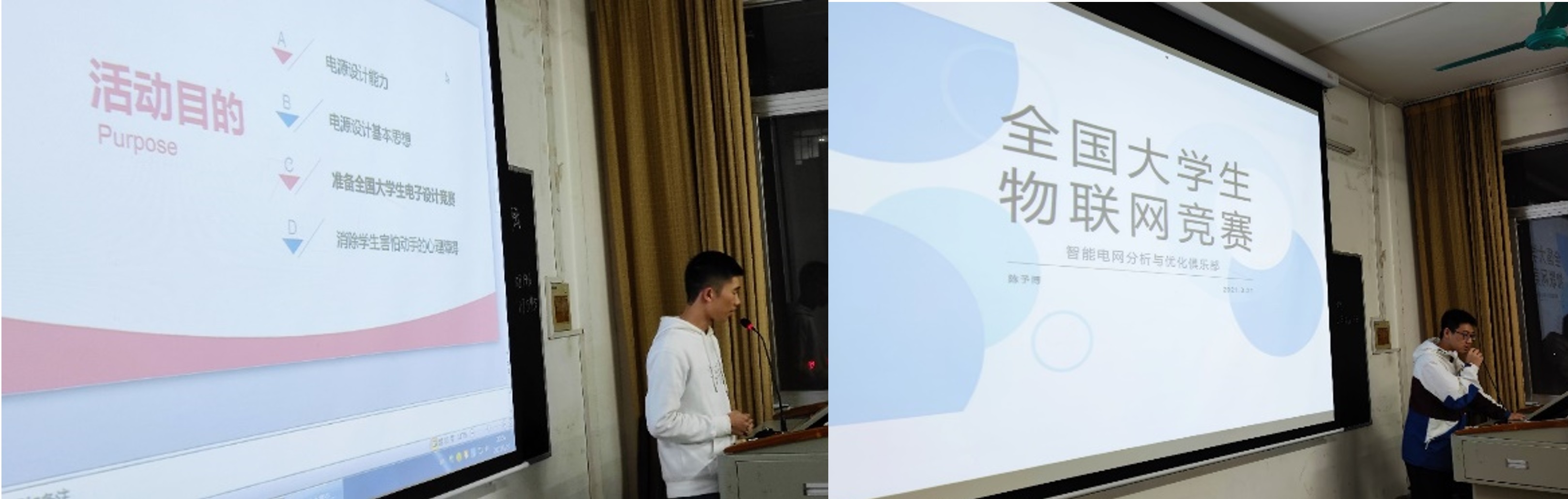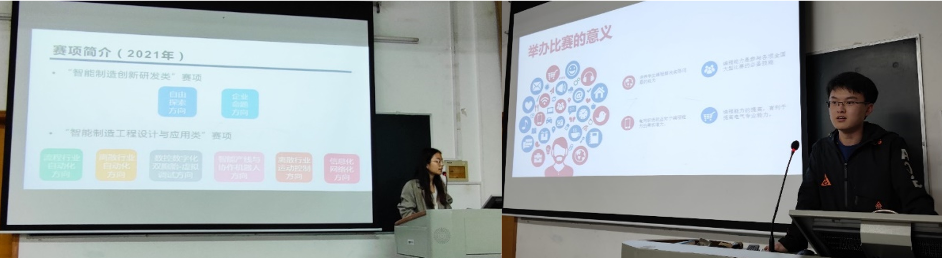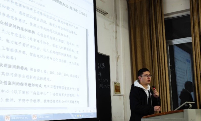 孫昕同學(xué)代表創(chuàng)新創(chuàng)業(yè)中心對(duì)“互聯(lián)網(wǎng)+”、“挑戰(zhàn)杯”等競賽進(jìn)行了講解和介紹,并介紹了眾創(chuàng)空間的創(chuàng)業(yè)孵化基地;姜炳旭、徐佳琪、鄭靜妍、陳予博、羅洪丹、莫明山、劉東端等同學(xué)分別對(duì)“全國大學(xué)生節(jié)能減排大賽”、“臺(tái)達(dá)杯高校自動(dòng)化設(shè)計(jì)大賽”、“學(xué)院程序設(shè)計(jì)大賽”、“西門子杯中國智能制造挑戰(zhàn)賽”、“全國大學(xué)生物聯(lián)網(wǎng)競賽”、“學(xué)院工程軟件設(shè)計(jì)大賽”、“學(xué)院電源設(shè)計(jì)大賽競賽”、“學(xué)院潮流計(jì)算競賽”等各類“雙創(chuàng)”大賽進(jìn)行了宣講動(dòng)員和經(jīng)驗(yàn)分享。通過分享為同學(xué)們展示了創(chuàng)新創(chuàng)業(yè)賽事的多元可能性,使同學(xué)們認(rèn)識(shí)到了電氣工程與自動(dòng)化專業(yè)知識(shí)儲(chǔ)備在競賽中的重要性,加強(qiáng)了同學(xué)們的創(chuàng)新精神和創(chuàng)業(yè)意識(shí)。
