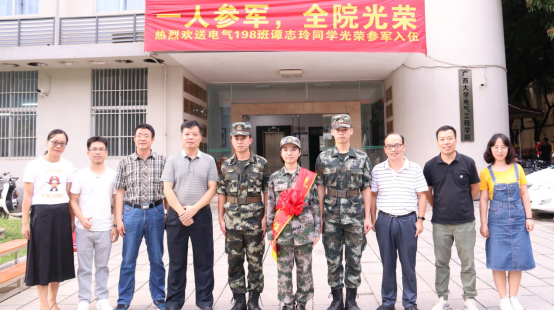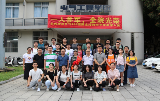 9月14日下午,電氣工程學(xué)院開展了歡送電氣類198班譚志玲同學(xué)參軍入伍的留影話別活動。學(xué)院黨委書記梁京章、院長雙豐、黨委副書記梁志堅(jiān)以及電氣198班班主任鄺永明、學(xué)工組全體老師、退伍大學(xué)生代表、電氣類198班同學(xué)參加了此次活動。