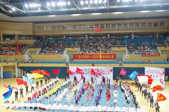 10月31日晚,廣西大學(xué)第四十八屆校運(yùn)會(huì)啦啦操比賽于廣西大學(xué)西校園新體育館正式舉行。我院黨委書記梁京章老師、院長雙豐老師、副書記梁志堅(jiān)老師親臨現(xiàn)場指導(dǎo)隊(duì)員參賽。伴著激昂的音樂和觀眾們的吶喊助威,啦啦操隊(duì)員們身著靚服,胸有成竹地步入比賽現(xiàn)場,比賽正式拉開帷幕。