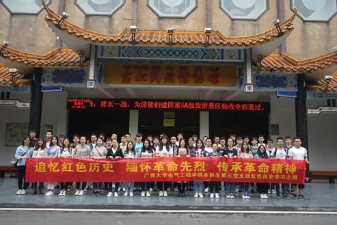 2018年10月14日,廣西大學電氣工程學院本科生第三黨支部一行49人(含積極分子)赴紅色根據地百色開展主題黨日活動,接受老一輩革命先烈事跡的再教育。期間,先后參觀了鄧小平手跡碑林、百色起義紀念館、紅軍橋、右江民族博物館、粵東會館。