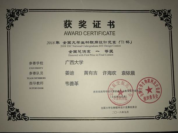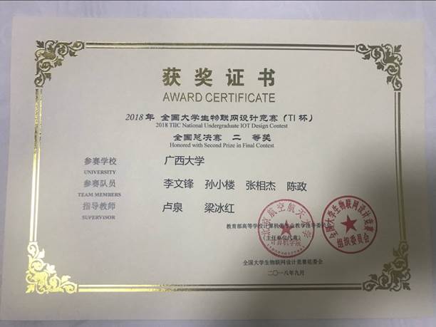 今年8月,我學院有3支學生隊伍代表廣西大學參加2018年全國大學生物聯(lián)網(wǎng)設計競賽(TI杯)的華中及西南分賽區(qū)比賽,獲賽區(qū)特等獎2項(并入圍全國總決賽)、賽區(qū)二等獎1項。