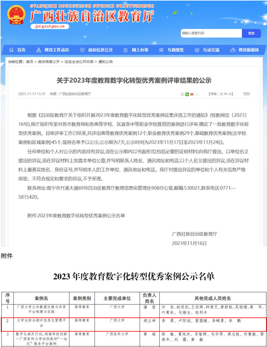 近日,廣西壯族自治區(qū)教育廳根據(jù)《自治區(qū)教育廳關于組織開展2023年度教育數(shù)字化轉(zhuǎn)型優(yōu)秀案例征集評選工作的通知》(桂教網(wǎng)信〔2023〕16號),組織專家對各市教育局和各高等學校、區(qū)直各中等職業(yè)學校推薦的案例進行評審,我院“大學生綜合測評信息化管理平臺”獲評教育數(shù)字化轉(zhuǎn)型優(yōu)秀案例。 圖 | 廣西壯族自治區(qū)教育廳公示信息 “大學生綜合測評信息化管理平臺”項目是基于學院程序設計大賽競賽題目孵化的產(chǎn)品,在胡立坤、李勇等老師的指導下,通過組建師生聯(lián)合研發(fā)團隊,面向目前大學生綜合測評的主要工作,自主研發(fā)了一套大學生綜合測評信息化管理平臺,解決了傳統(tǒng)學生綜合測評工作中存在的數(shù)據(jù)采集與管理繁瑣以及測評流程不規(guī)范、數(shù)據(jù)保存及分析難等問題。在學院學工組和教學辦的大力支持下,多位師生的共同努力下,該平臺已在學院近3年的學生綜合測評中應用,極大提高了學生綜合評價工作的效率,提升了學院辦公的數(shù)字化與信息化水平。 據(jù)悉,在教育數(shù)字化轉(zhuǎn)型進程中,電氣工程學院始終秉承創(chuàng)新精神和實踐探索,致力于構(gòu)建智慧教育和提升教育教學質(zhì)量。除“大學生綜合測評信息化管理平臺”外,我院師生合作自主研發(fā)的“教師公共服務學時統(tǒng)計系統(tǒng)”“課程達成度分析信息化系統(tǒng)”等一系列教育數(shù)字化平臺,也逐步投入使用。在多個數(shù)字化與信息化系統(tǒng)的研發(fā)中,吸引了我院越來越多的學生參與,近2年,基于學院眾創(chuàng)空間平臺,通過組織學生參與院級競賽項目和系統(tǒng)研發(fā)項目的訓練,培養(yǎng)了百余名具有數(shù)字化與信息化系統(tǒng)開發(fā)經(jīng)驗的學生。此次優(yōu)秀案例的入選,也表明我院推進“新工科”教育改革中基于眾創(chuàng)空間平臺實現(xiàn)理論與實踐相結(jié)合,“以賽促學、以賽促教、以賽促創(chuàng)”,緊扣實際需求,孵化和轉(zhuǎn)化創(chuàng)新成果的工程教育模式在教育數(shù)字化轉(zhuǎn)型中具有代表性和推廣價值。 下一步,我院將繼續(xù)落實上級的各項要求,深化信息技術(shù)與教育教學的融合,持續(xù)推動教育數(shù)字化轉(zhuǎn)型,進一步提升教育質(zhì)量和效率,為培養(yǎng)更多優(yōu)秀人才貢獻力量。