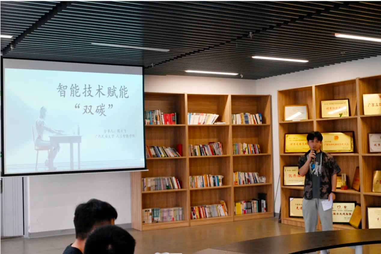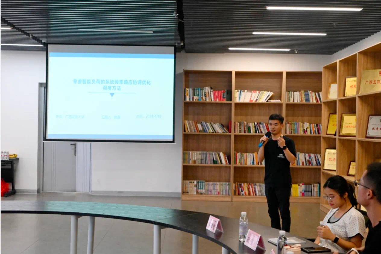 來(lái)自廣西大學(xué)電氣工程學(xué)院的黃羨飛分享了《基于通信策略的船助無(wú)人機(jī)巡檢方案研究》,設(shè)計(jì)了使用船和無(wú)人機(jī)對(duì)海上風(fēng)電場(chǎng)中的故障巡檢方案;廣西醫(yī)科大學(xué)公共衛(wèi)生學(xué)院的歐柳娟同學(xué)分享了在醫(yī)學(xué)領(lǐng)域比較重要的數(shù)據(jù)庫(kù);廣西民族大學(xué)電子信息學(xué)院的姚康同學(xué)分享了考慮智能負(fù)荷的頻率響應(yīng)資源優(yōu)化調(diào)度方法;廣西民族大學(xué)人工智能學(xué)院的周日飛同學(xué)介紹了他們利用人工智能技術(shù)開(kāi)發(fā)的鷹眼警情分析系統(tǒng);廣西大學(xué)機(jī)械工程學(xué)院的趙星辰同學(xué)分享了利用微波熱解系統(tǒng),有效且低成本地將生物質(zhì)原料轉(zhuǎn)化為生物柴油的清潔實(shí)驗(yàn);廣西中醫(yī)藥大學(xué)公共衛(wèi)生與管理學(xué)院的謝翠微同學(xué)結(jié)合廣西多地分級(jí)診療建設(shè)情況,分享了調(diào)研的思考;南寧師范大學(xué)地理科學(xué)與規(guī)劃學(xué)院譚家鑫同學(xué)運(yùn)用地圖可視化和莫蘭指數(shù)分析,為制定碳減排政策提供建議;廣西大學(xué)化學(xué)化工學(xué)院的徐愛(ài)浩同學(xué)分享了高效電催化CO2還原制備甲酸鹽技術(shù)。