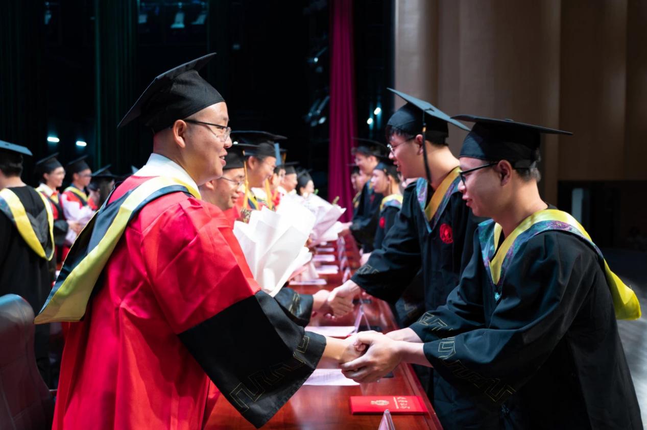 在熱烈的氣氛中,梁志堅書記,武新章院長,劉輝副書記、副院長,黎靜華教授,胡立坤教授,張鐿議教授,李畸勇副院長為2024屆博士畢業(yè)生、碩士畢業(yè)生、本科畢業(yè)生授予學(xué)位,畢業(yè)生們分批上臺接受撥穗并合影留念。