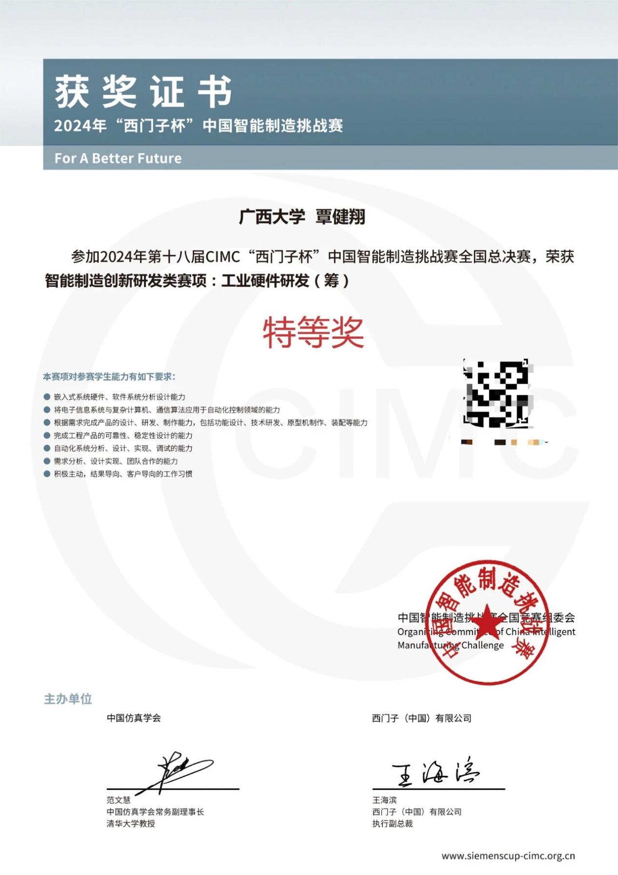 8月11日至15日,2024年CIMC“西門子杯”中國智能制造挑戰(zhàn)賽全國總決賽在中國湖州舉行,由我院胡立坤教授指導(dǎo)的覃健翔“鐮刀和錘頭隊”,首次在智能制造創(chuàng)新研發(fā)類賽項:工業(yè)硬件研發(fā)(籌)賽項中斬獲全國特等獎。本次參賽項目獲電氣工程學(xué)院2024年度“研究生素質(zhì)能力提升類項目”的資助。覃健翔同學(xué)為我院2022級控制工程專業(yè)碩士研究生。 初賽階段,我校參賽團隊共獲一等獎1項,二等獎6項,三等獎2項。 獲獎證書 大賽受教育部國際合作與交流司指導(dǎo),由中國仿真學(xué)會和西門子(中國)有限公司聯(lián)合主辦,是中國智能制造領(lǐng)域規(guī)模最大、規(guī)格最高的國家A類競賽,2006年至今大賽已成功舉辦18屆。大賽內(nèi)容涉及智能制造領(lǐng)域中的科技創(chuàng)新、產(chǎn)品研發(fā)、工程設(shè)計和智能應(yīng)用等,為我國智能制造發(fā)展培養(yǎng)和選拔具備解決復(fù)雜工程問題的技術(shù)及創(chuàng)新人才。 胡立坤教授(右)與覃健翔同學(xué)(左)合影留念 本屆比賽吸引了來自全國31個省、自治區(qū)、直轄市共756所高校、5861支隊伍、超25000名師生參賽。最后,共有298所高校的596支隊伍角逐全國總決賽的9個賽項冠軍。 覃健翔同學(xué)(右二)上臺領(lǐng)獎合影 本次參賽作品是基于單片機開發(fā)的一款分布式IO設(shè)備,可實現(xiàn)工業(yè)MODBUS-RTU協(xié)議通訊,支持8位數(shù)字量輸入和8位數(shù)字量輸出功能,并支持高速脈沖計數(shù)及高速脈沖輸出功能,該參賽作品先前已集成于通知書分揀設(shè)備中,用于實現(xiàn)設(shè)備的所有控制功能。 覃健翔同學(xué)參賽作品(圖片右下方)