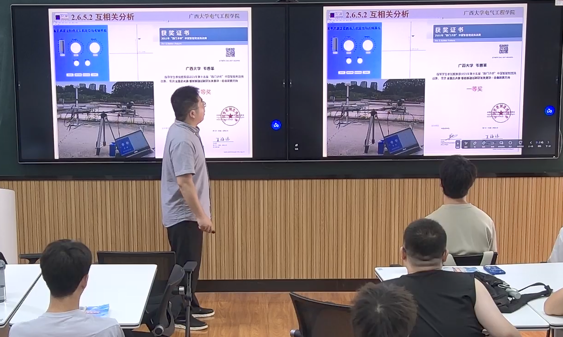 在學習完相關(guān)分析法的基本原理和應(yīng)用案例之后,韋老師引出了“理論公式如何進行實際應(yīng)用?如何用計算機編程來實現(xiàn)互相關(guān)計算”的問題,并以往屆學長們在大創(chuàng)項目、學科競賽中取得的優(yōu)秀成果為例,使同學們深刻體會到理論與實踐相結(jié)合的重要性,激發(fā)了練就理論聯(lián)系實際真功夫的信念,并引導同學們在課后利用競賽、大創(chuàng)、課程設(shè)計、仿真和實驗來鍛煉和強化實踐動手能力。