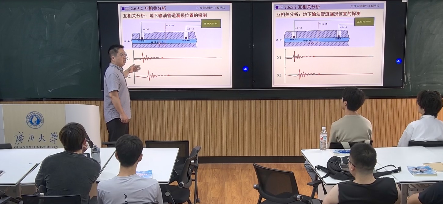 在課程后半段,在韋老師結(jié)合板書、多媒體和短時視頻動畫,講解、推導和分析互相關(guān)分析法的數(shù)學原理和特點的基礎(chǔ)上,以“使用互相關(guān)分析法監(jiān)測地下輸油管道泄漏位置”的工程案例,介紹我國“一帶一路油氣合作”項目取得的成果,使同學們在深刻理解“一帶一路”時代內(nèi)涵的同時,樹立了專業(yè)自信和服務(wù)“一帶一路”建設(shè)的理念,增強了“學有所成、技術(shù)報國”信念。
