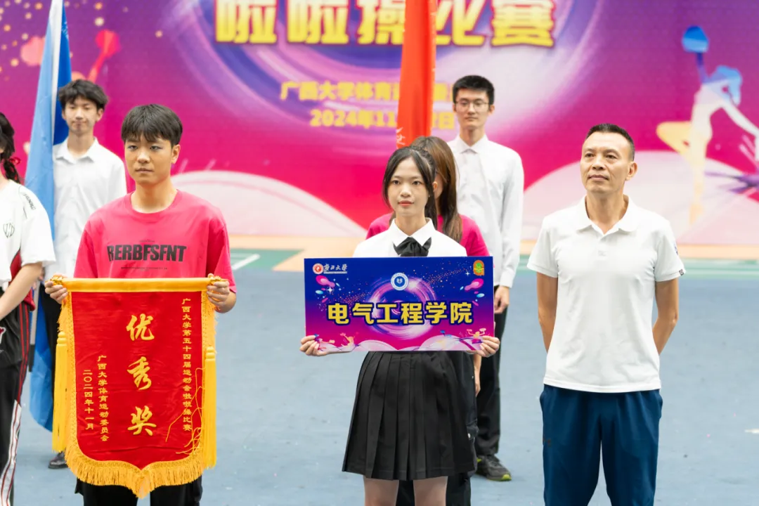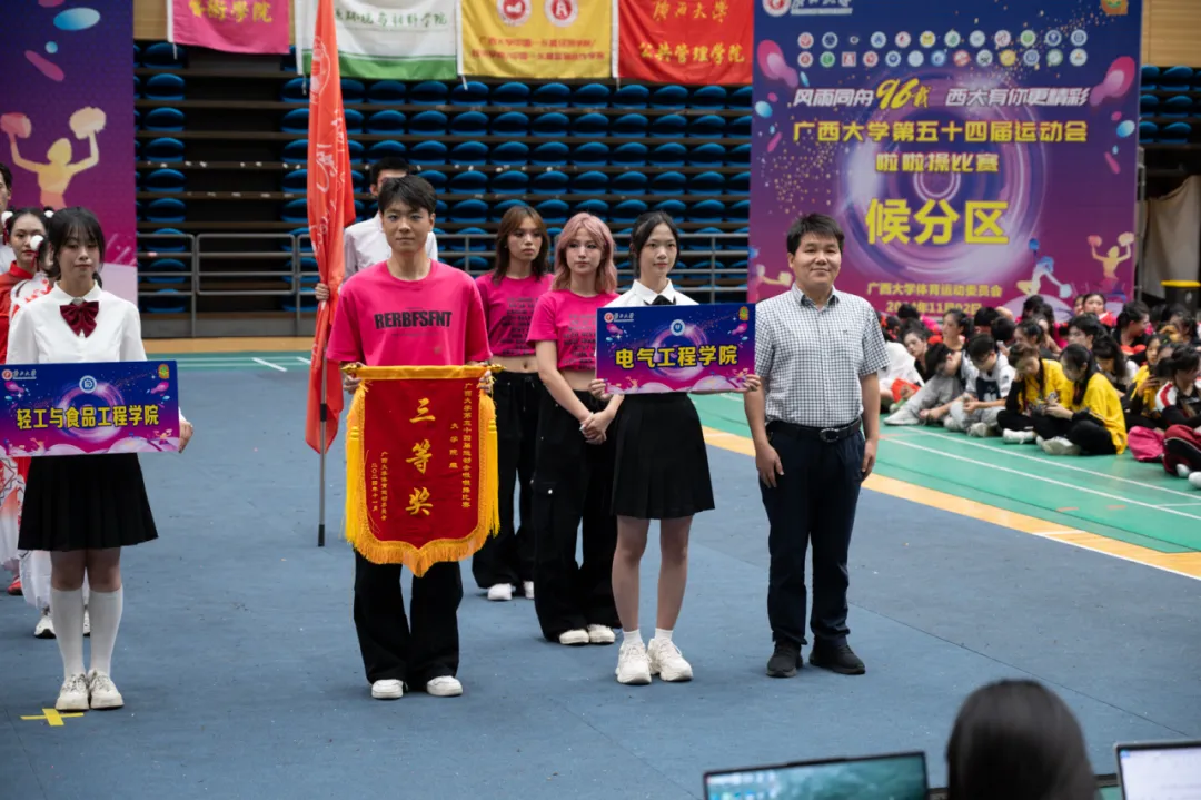 01 開幕式及頒獎(jiǎng) 風(fēng)雨同舟96載,西大有你更精彩。11月2日下午,廣西大學(xué)第五十四屆運(yùn)動(dòng)會(huì)啦啦操比賽在西校園綜合體育館如期開幕。經(jīng)過一番“舞動(dòng)乾坤”的較量,我院參賽隊(duì)伍榮獲大學(xué)院組三等獎(jiǎng)、體育道德風(fēng)尚獎(jiǎng)及優(yōu)秀獎(jiǎng)。 開幕式我院隊(duì)伍入場(chǎng) 我院榮獲三等獎(jiǎng) 我院獲得獎(jiǎng)勵(lì) 02 啦啦隊(duì)風(fēng)采 電氣工程學(xué)院啦啦操運(yùn)動(dòng)員們身著絢麗奪目的火龍果色隊(duì)服,如花的笑臉綻放著青春的活力。他們?nèi)缡⒎诺幕ǘ洌琰c(diǎn)燃夜空的煙花,盡顯生命力量! 啦啦隊(duì)員在表演 啦啦隊(duì)員在表演 英姿颯爽,自信張揚(yáng),像劃破黑暗的電光,他們的每次旋轉(zhuǎn)跳躍都能讓人眼前一亮! 啦啦隊(duì)員在表演 啦啦隊(duì)員在表演 他們用激情和汗水,在賽場(chǎng)上書寫著青春華章,盡顯青春活力之美,讓滿場(chǎng)觀眾無不沉醉在這熱血沸騰的活力盛宴中,為他們獻(xiàn)上熱烈的掌聲!繼續(xù)帶著刻苦拼搏精神向前走吧,奮進(jìn)的電氣學(xué)子們!文明其精神,野蠻其體魄,為建設(shè)更積極向上的校園文化貢獻(xiàn)青春力量! 我院仇翹楚同學(xué)(中)獲得“優(yōu)秀運(yùn)動(dòng)員”表彰 我院學(xué)子在加油助威 賽后合照