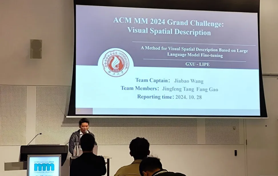 近日,第32屆ACM國際多媒體會議在澳大利亞墨爾本落下帷幕。該會議由美國計算機學(xué)會(Association for Computing Machinery,簡稱ACM)主辦,同時其主辦?的視覺空間描述重大挑戰(zhàn)(Grand Challenge: Visual Spatial Description,簡稱VSD2024)公布競賽結(jié)果并頒發(fā)獲獎證書。?我院廣西電力裝備智能控制與運維重點實驗室高放教授帶領(lǐng)的GXU-LIPE團隊榮獲挑戰(zhàn)賽第四名,同時受邀撰寫論文并進行口頭報告。 所獲獎狀 ACM Multimedia是由美國計算機學(xué)會主辦的計算機視覺和多媒體處理領(lǐng)域的頂級國際會議,也是中國計算機學(xué)會推薦的該領(lǐng)域A類國際學(xué)術(shù)會議。每年大會特設(shè)主題挑戰(zhàn)競賽(Grand Challenges),遴選自全球相關(guān)領(lǐng)域的前沿主題。 VSD2024屬于視覺空間語義理解的研究領(lǐng)域。在該挑戰(zhàn)賽中,模型需要生成一個準(zhǔn)確的文本描述句子,來描述輸入圖像中兩個給定目標(biāo)對象之間的空間關(guān)系。主辦方提供了一個大規(guī)模的視覺空間描述數(shù)據(jù)集,包含29,272個高質(zhì)量手動標(biāo)注的圖像—文本對。 GXU-LIPE團隊由高放教授和課題組研究生王家寶、唐鏡峰組成。團隊受邀撰寫了論文《A Method for Visual Spatial Description Based on Large Language Model Fine-tuning》發(fā)表在第32屆ACM國際多媒體會議,并前往墨爾本進行口頭報告。 科研團隊在做報告 GXU-LIPE團隊設(shè)計了一種創(chuàng)新的基于大模型的方法,通過微調(diào)大語言模型FLANXXL提升了視覺空間關(guān)系描述的效果。首先通過預(yù)訓(xùn)練模型提取圖像特征和文本特征,然后采用Q-former進行特征融合,最終通過大語言模型輸出文本描述。為解決LLM特征捕獲困難的問題,將原始特征與融合后的特征一并輸入FLANXXL,并采用數(shù)據(jù)增強、先驗知識和多種訓(xùn)練策略等進行微調(diào),具體包括提升文本多樣性、引入對象重疊先驗、基于動量蒸餾篩選難負樣本及生成軟標(biāo)簽,基于權(quán)重平衡長尾數(shù)據(jù)等。通過多模態(tài)特征融合和微調(diào),模型在挑戰(zhàn)賽測試集上表現(xiàn)優(yōu)異,生成了準(zhǔn)確且更真實的對象空間關(guān)系描述文本。 概念圖 本次參加ACM MM會議由廣西大學(xué)“2024年研究生素質(zhì)能力提升項目”資助,為LIPE重點實驗室提供了寶貴的國際交流機會,提升在視覺語言處理、多模態(tài)融合、人工智能等領(lǐng)域的科研能力。王家寶同學(xué)表示,在多媒體處理和計算機視覺應(yīng)用的快速發(fā)展背景下,此次參會有助于深入了解國際領(lǐng)先的研究動向、結(jié)識領(lǐng)域?qū)<遥楹罄m(xù)課題研究提供創(chuàng)新靈感和新的合作機會。