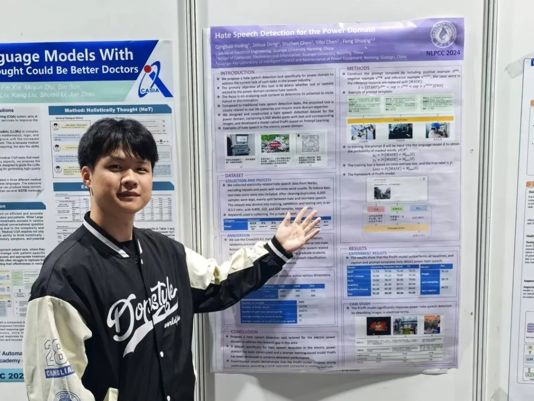 11月1日至3日,由中國計(jì)算機(jī)學(xué)會主辦,西湖大學(xué)承辦的第十三屆CCF自然語言處理與中文計(jì)算國際會議(International Conference on Natural Language Processing and Chinese Computing,以下簡稱“NLPCC”)在浙江杭州舉辦。來自國內(nèi)外多所高校、科研機(jī)構(gòu)和企業(yè)的專家學(xué)者齊聚一堂,共同探討NLP領(lǐng)域的最新進(jìn)展和發(fā)展方向。我院2022級碩士生鄧澤華同學(xué)獲得廣西大學(xué)研究生倍增計(jì)劃資助參加本次會議并作論文展示。 師生合影(左一為鄧澤華同學(xué)) NLPCC從2012年開始舉辦,至今已成功舉辦13屆,是中國計(jì)算機(jī)學(xué)會自然語言處理技術(shù)委員會(CCF-NLP)的年度會議。會議旨在為來自學(xué)術(shù)界、工業(yè)界和政府的研究人員和從業(yè)人員提供開放的平臺,與會者分享各自想法、研究成果和經(jīng)驗(yàn),通過會議可以促進(jìn)各自在該領(lǐng)域的研究和技術(shù)創(chuàng)新。 據(jù)悉,本屆大會共收到461篇投稿,其中40篇接收為口頭報(bào)告,121篇被錄取為海報(bào)(poster)。大會特別設(shè)立了海報(bào)交流環(huán)節(jié),邀請了自然語言處理領(lǐng)域國際頂級期刊和會議論文作者與參會代表進(jìn)行了現(xiàn)場交流。鄧澤華參會論文《Hate Speech Detection for the Power Domain》獲得海報(bào)展示,該論文提出了一個(gè)能源領(lǐng)域的諷刺數(shù)據(jù)集,為隱喻檢測領(lǐng)域探索了一個(gè)新的方向。 鄧澤華同學(xué)做poster展示 會后,鄧澤華表示,此次國際會議為他提供了寶貴的鍛煉平臺,讓他有機(jī)會與國內(nèi)外的學(xué)術(shù)同行進(jìn)行深入交流與思想碰撞。同時(shí),他對學(xué)校提供的資助表達(dá)感激,對導(dǎo)師黃清寶教授的耐心指導(dǎo)致以敬意。