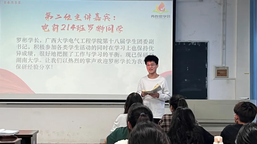 為深入學(xué)習(xí)宣傳貫徹黨的教育方針,積極響應(yīng)習(xí)近平總書(shū)記關(guān)于青年成長(zhǎng)成才的重要論述,幫助廣大青年學(xué)子全面理解保研、考研的實(shí)踐路徑,明確個(gè)人職業(yè)規(guī)劃,激發(fā)內(nèi)在潛能與斗志,11月19日,我院在學(xué)院304教室開(kāi)展“青春?jiǎn)⒑剑罕?/span>研之路的經(jīng)驗(yàn)之光”主題青春思享薈活動(dòng)。本次活動(dòng)由共青團(tuán)廣西大學(xué)委員會(huì)主辦,共青團(tuán)廣西大學(xué)電氣工程學(xué)院委員會(huì)承辦,院學(xué)生會(huì)策劃開(kāi)展,學(xué)院團(tuán)委、學(xué)生會(huì)骨干參加活動(dòng)。 01 第一位青春宣講人-劉洧杰 劉洧杰,廣西大學(xué)電氣工程學(xué)院第二十二屆學(xué)生會(huì)執(zhí)行主席,學(xué)習(xí)成績(jī)優(yōu)異,科研競(jìng)賽成果豐富,現(xiàn)已成功保研至華北電力大學(xué)。劉洧杰同學(xué)分享了從考研備考到保研成功的過(guò)程,強(qiáng)調(diào)了保研之路中“硬實(shí)力”與“軟實(shí)力”并重的關(guān)鍵性。他提到,在致力于提高學(xué)業(yè)成績(jī)、鞏固學(xué)術(shù)基礎(chǔ)、追求競(jìng)賽獲獎(jiǎng)以及高分通過(guò)六級(jí)英語(yǔ)考試這些“硬實(shí)力”的同時(shí),也應(yīng)充分利用在學(xué)生組織中的工作經(jīng)驗(yàn)這一“軟實(shí)力”,以全方位提升個(gè)人的綜合競(jìng)爭(zhēng)力。 劉洧杰同學(xué) 02 第二位青春宣講人-羅彬 羅彬,廣西大學(xué)電氣工程學(xué)院第十八屆學(xué)生團(tuán)委副書(shū)記,成績(jī)優(yōu)異,積極參與學(xué)生活動(dòng),有效平衡工作與學(xué)習(xí),現(xiàn)已保研至湖南大學(xué)。羅彬同學(xué)著重闡述了參加夏令營(yíng)與預(yù)推免的關(guān)鍵作用,強(qiáng)調(diào)了維持優(yōu)異成績(jī)的必要性,同時(shí)提供了選擇導(dǎo)師與學(xué)校的寶貴建議。他指出,保研過(guò)程中需平衡學(xué)業(yè)與課外活動(dòng),積極籌備面試,并明智地挑選目標(biāo)院校與導(dǎo)師。羅彬還鼓勵(lì)道,保研之路并非一帆風(fēng)順,要以平常心面對(duì),只要持之以恒,終將渡過(guò)難關(guān)。 羅彬同學(xué) 此次活動(dòng),是學(xué)院推動(dòng)學(xué)風(fēng)建設(shè)而采取的行動(dòng),為青年學(xué)子搭建了一個(gè)信息交流、經(jīng)驗(yàn)傳遞的平臺(tái),助力低年級(jí)同學(xué)們在學(xué)術(shù)深造與未來(lái)規(guī)劃的道路上邁出更加堅(jiān)實(shí)的一步。