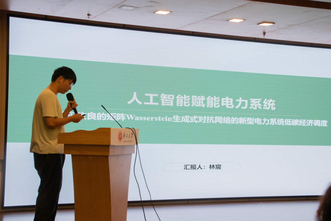 電自創(chuàng)培班21級(jí)本科生林宸同學(xué)探討了人工智能在新型電力系統(tǒng)領(lǐng)域的應(yīng)用。他匯報(bào)了基于改良矩陣Wasserstein生成對(duì)抗網(wǎng)絡(luò)賦能新型電力系統(tǒng)低碳經(jīng)濟(jì)調(diào)度的研究,通過結(jié)合電力系統(tǒng)信息、經(jīng)濟(jì)調(diào)度成本和碳排放成本,同時(shí)考慮各種系統(tǒng)約束,來生成最優(yōu)調(diào)度方案。與傳統(tǒng)遺傳算法相比,他的新算法可以大大縮短調(diào)度時(shí)間,具有更好的實(shí)用性,可應(yīng)用于電力市場運(yùn)行和系統(tǒng)建設(shè)。