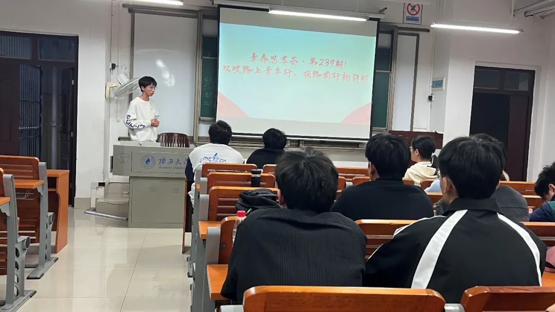 為深入學(xué)習(xí)貫徹習(xí)近平總書(shū)記關(guān)于碳達(dá)峰碳中和工作的重要論述,幫助青年學(xué)子理解習(xí)近平新時(shí)代中國(guó)特色社會(huì)主義思想對(duì)我國(guó)生態(tài)文明建設(shè)的重要影響,12月17日,我院在六教108教室開(kāi)展了“‘碳’路青年,共筑未來(lái)”主題青春思享薈沙龍。本次活動(dòng)由共青團(tuán)廣西大學(xué)委員會(huì)主辦,學(xué)院團(tuán)委承辦,院學(xué)生會(huì)策劃開(kāi)展。 分享會(huì)上,與會(huì)成員深入學(xué)習(xí)了習(xí)近平總書(shū)記關(guān)于碳達(dá)峰碳中和工作的重要論述,并集體觀看了“推動(dòng)實(shí)現(xiàn)‘雙碳’目標(biāo),書(shū)寫(xiě)綠色發(fā)展答卷”的新聞聯(lián)播短片。大家認(rèn)識(shí)到,黨的十八大以來(lái),以習(xí)近平同志為核心的黨中央深刻把握生態(tài)文明建設(shè)在新時(shí)代中國(guó)特色社會(huì)主義事業(yè)中的重要地位和戰(zhàn)略意義,創(chuàng)造性地提出一系列新理念新思想新戰(zhàn)略,形成了習(xí)近平生態(tài)文明思想,為新時(shí)代生態(tài)文明建設(shè)、綠色低碳發(fā)展提供了根本遵循和行動(dòng)指南。 本期青春思享薈緊密銜接學(xué)院團(tuán)委“‘雙碳’路上青年行,探路前行韻自明”主題團(tuán)日活動(dòng)。作為主題團(tuán)日活動(dòng)的參會(huì)學(xué)生代表,沈鑫同學(xué)結(jié)合自身的專(zhuān)業(yè)知識(shí),分享了自己對(duì)“雙碳”目標(biāo)的理解,包括綠色電力、廣西綠色發(fā)展目標(biāo)等雙碳相關(guān)知識(shí)。龔旭彪同學(xué)也分享了自己的心得,他呼吁大家從點(diǎn)滴做起,勇于創(chuàng)新,用所學(xué)專(zhuān)業(yè)知識(shí)助力能源轉(zhuǎn)型和綠色發(fā)展,以實(shí)際行動(dòng)展現(xiàn)青年的責(zé)任與擔(dān)當(dāng),在“雙碳”征程中彰顯青春的價(jià)值。 沈鑫同學(xué)在分享參會(huì)心得 通過(guò)這次青春思享薈的深入交流與思想碰撞,同學(xué)們不僅增強(qiáng)了個(gè)人對(duì)生態(tài)文明建設(shè)和“雙碳”目標(biāo)重要性的認(rèn)識(shí),更激發(fā)了大家將理論知識(shí)轉(zhuǎn)化為實(shí)際行動(dòng)的決心與力量。青年是國(guó)家的未來(lái),民族的希望,面對(duì)新時(shí)代賦予的使命與挑戰(zhàn),電氣青年學(xué)子當(dāng)以更加飽滿(mǎn)的熱情、更加堅(jiān)定的信念,投身于生態(tài)文明建設(shè)的偉大實(shí)踐中,用實(shí)際行動(dòng)踐行綠色發(fā)展理念,為構(gòu)建美麗中國(guó)貢獻(xiàn)青春力量。