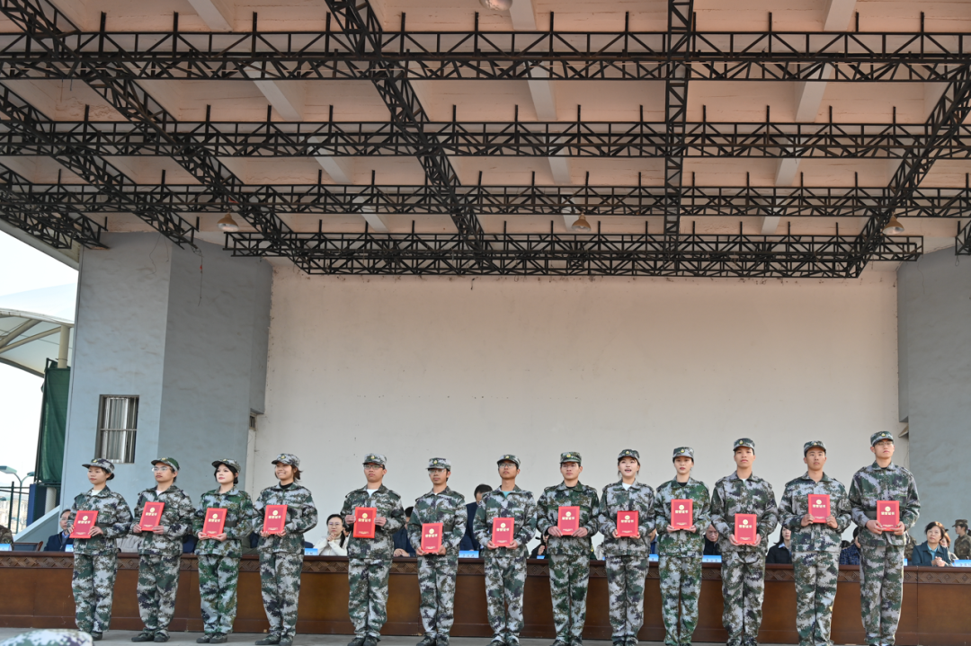 軍訓匯演后,校領導對此訓練活動中表現(xiàn)優(yōu)秀的連隊和個人進行頒獎。