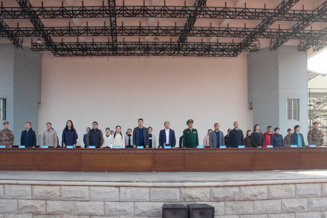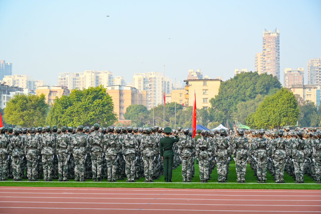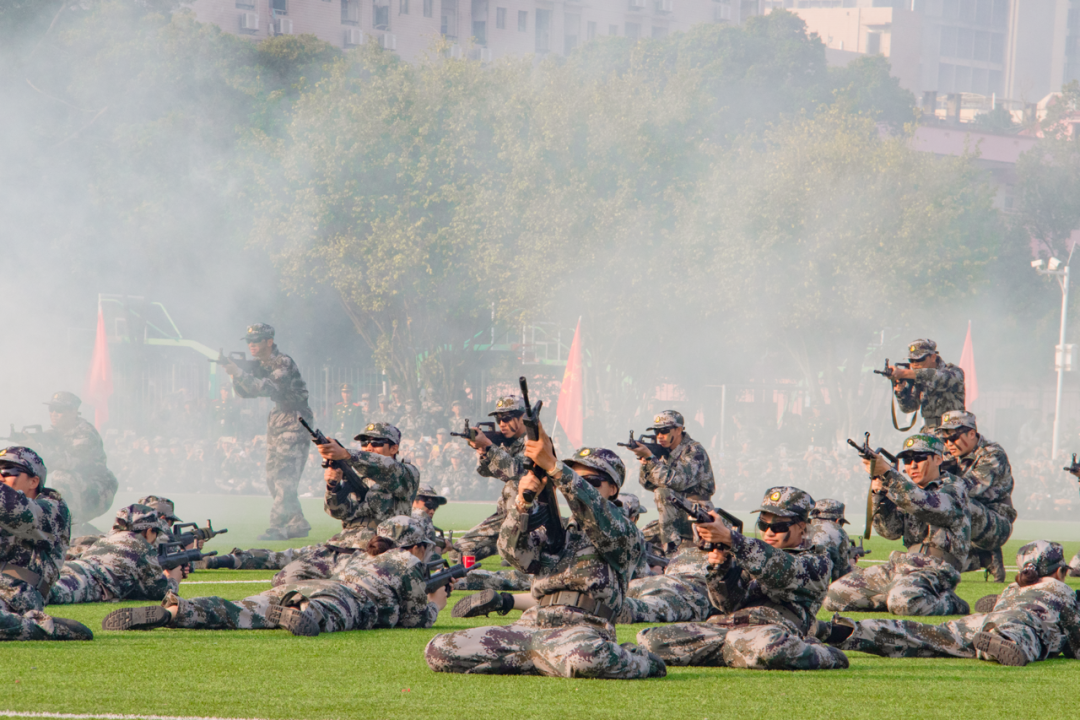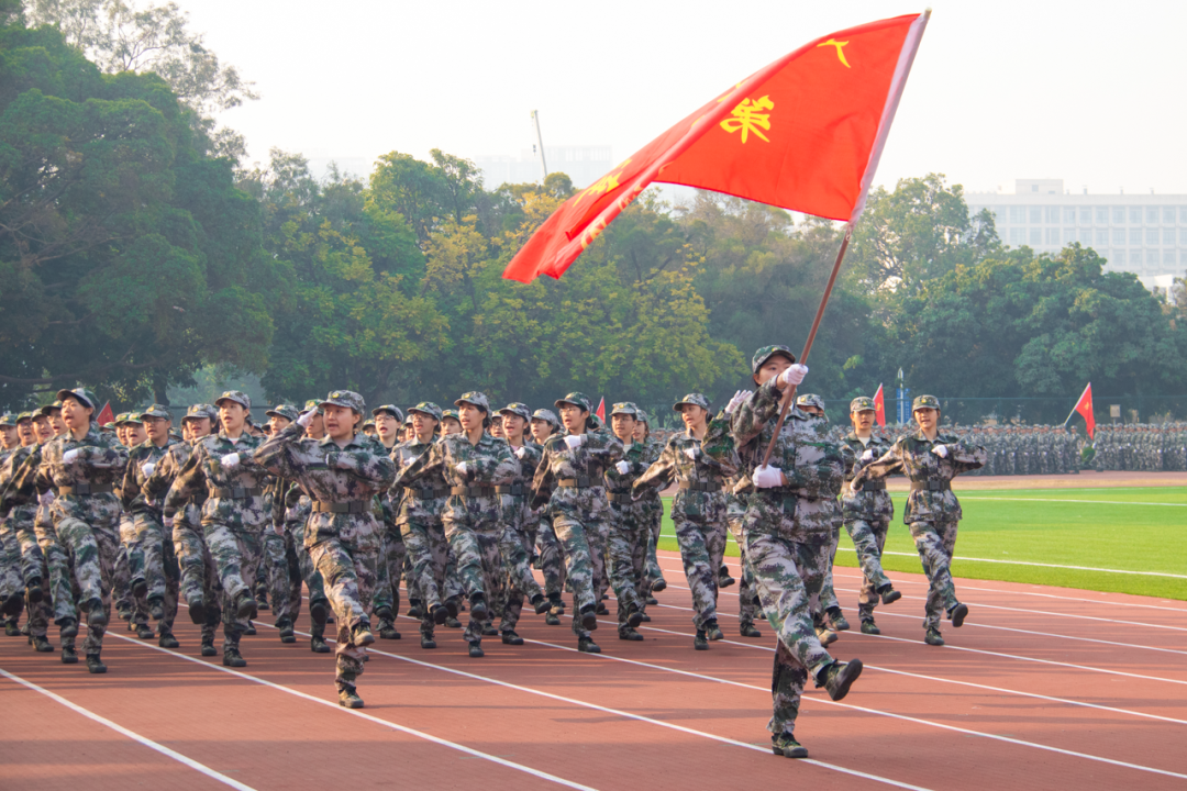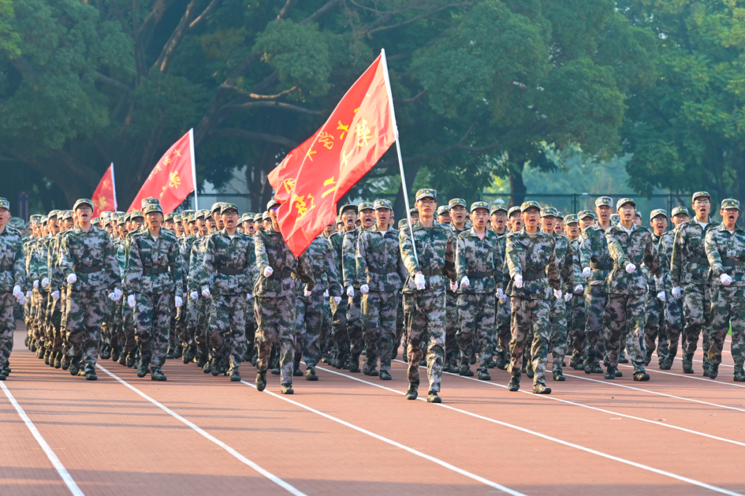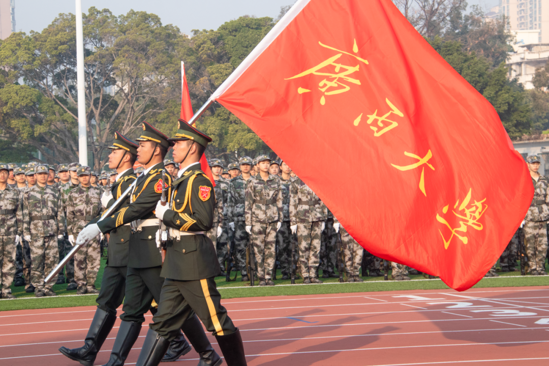 紅旗冉升,奏唱國歌。軍訓匯演拉開帷幕。