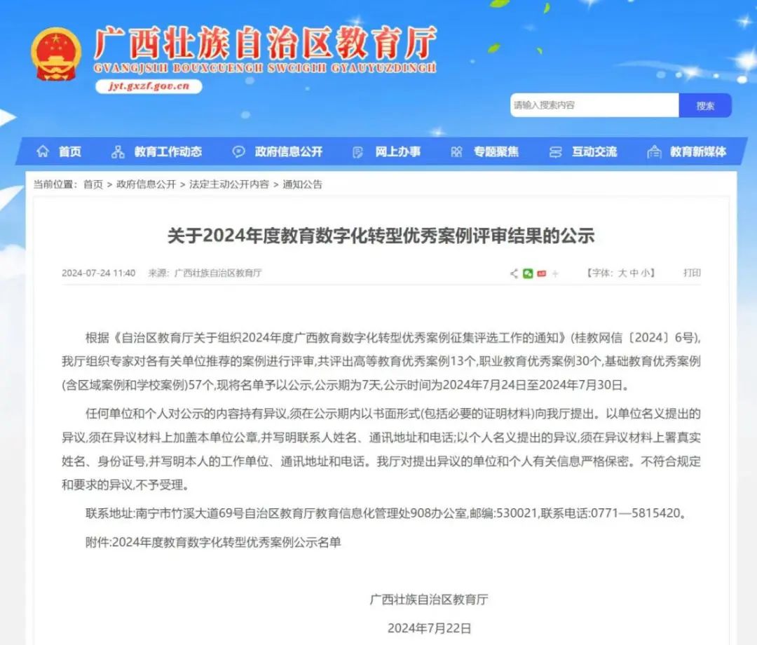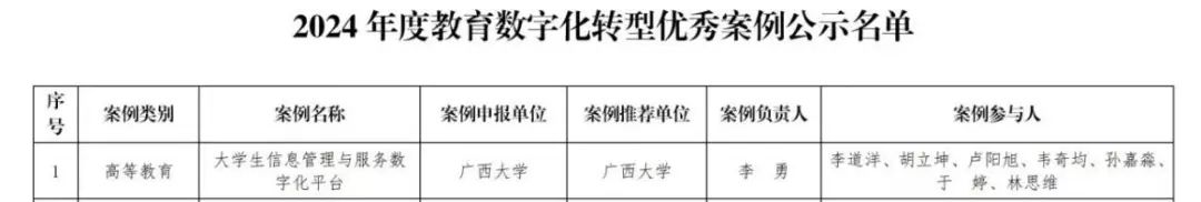 我院的《大學生信息管理與服務數(shù)字化平臺》入選廣西壯族自治區(qū)教育廳公布的2024年度教育數(shù)字化轉(zhuǎn)型優(yōu)秀案例名單優(yōu)秀案例。